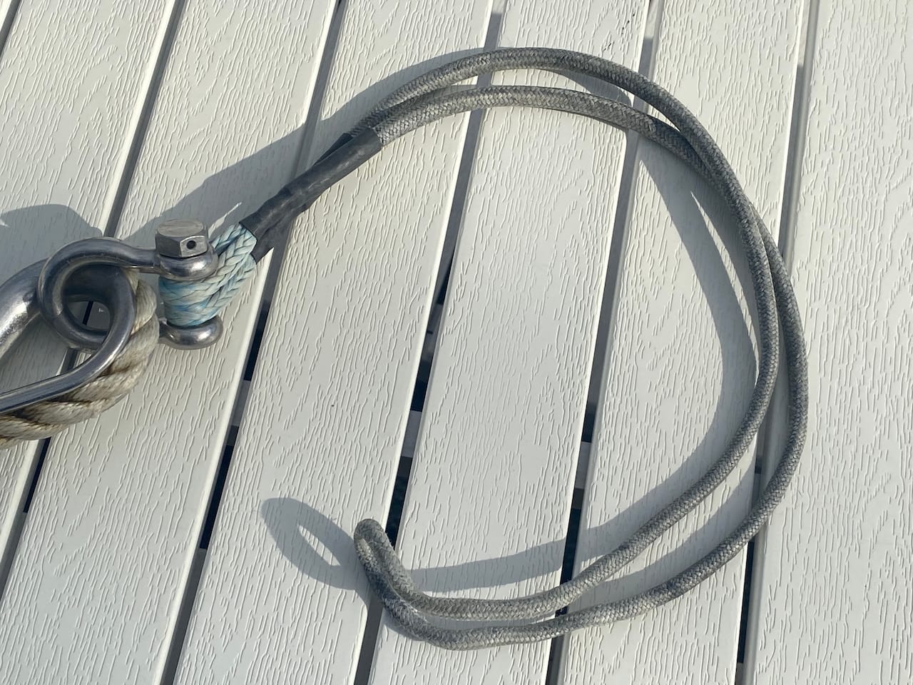 It is made of UHMWPE fiber which is extremely strong, and attaches to the chain by making a loop around a link. The easiest way to do this, short of taking the shackle apart every time, was to loop the whole bridle through the snubber, which took a bit of time, and meant for some tangled situations.