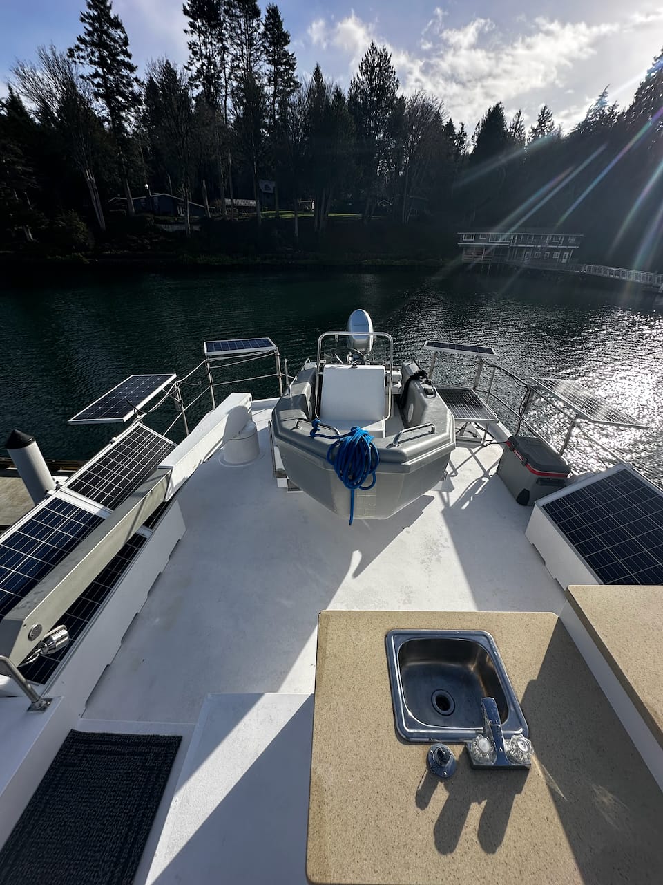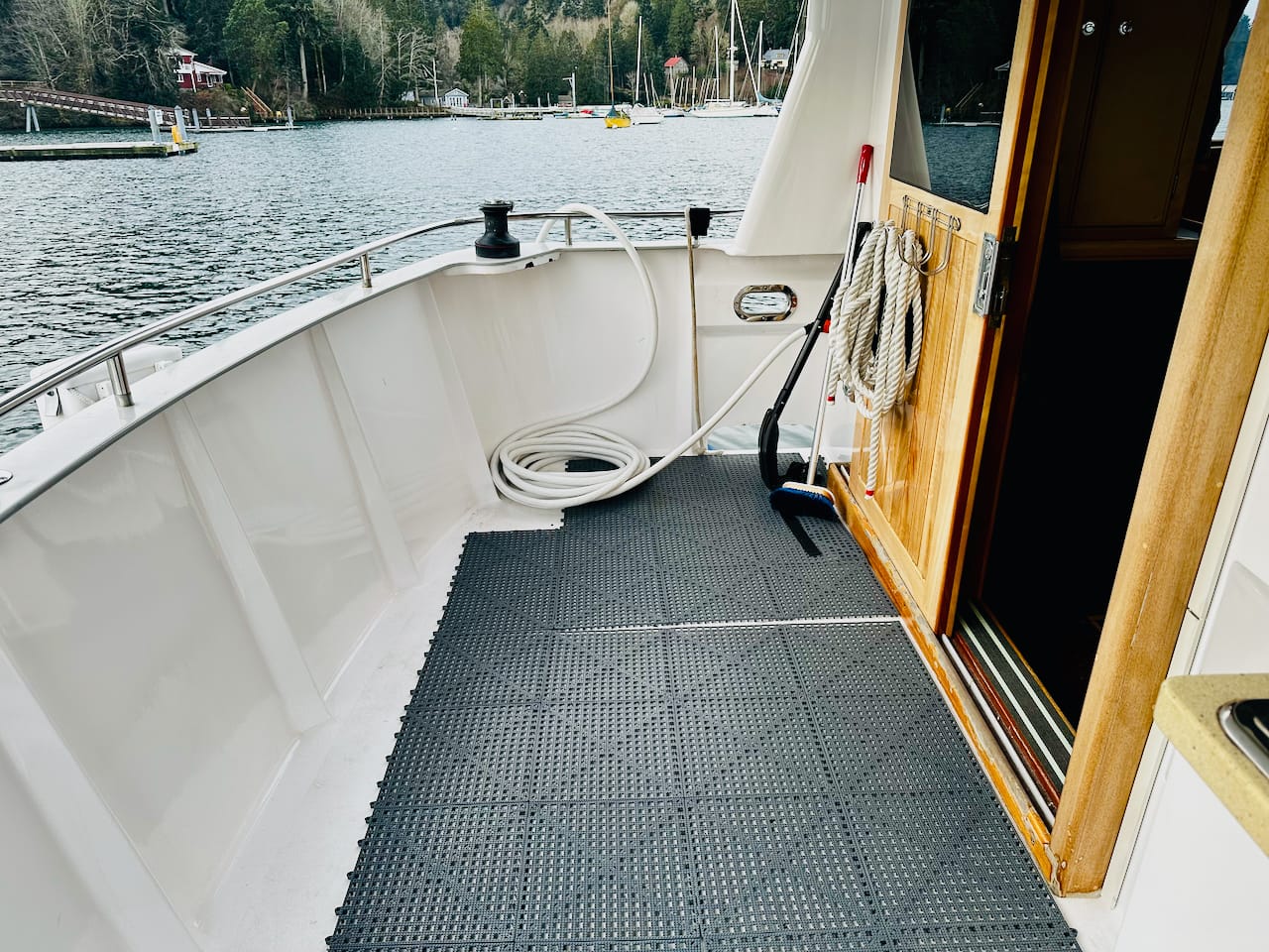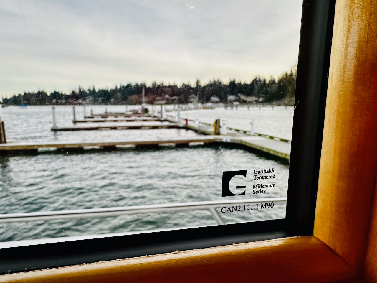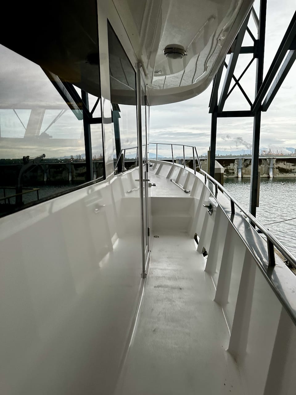 Since I'm out on the water a large part of the year, and much of it single handing, having a safe way to manage the boat outside is key. Aruna has a wonderful side decks that are super safe with overhangs to keep the rain off of the windows (pet peeve). Speaking of windows - all of them are flush with the boat surface, which I love the look of, but it also makes it easy to clean. And, they are dual pane windows, which is rare to see in any boat, even modern ones, and will cut down on condensation and temp issues.