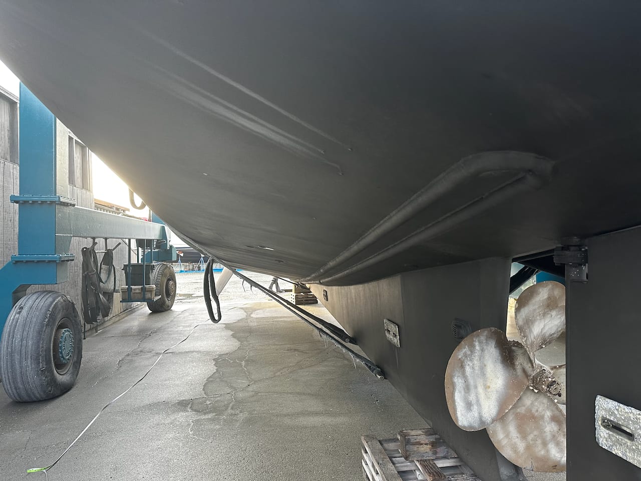 Aruna has a slightly different config with a single 320HP Isuzu continuous duty industrial engine married to a 2-1/2" shaft with a 4-blade propeller. Isuzu aren't as common in the US in boats as they are in Canada, and Klassen Diesel did the conversion and installation of the engine, and are still around to provide support. The engine has a much longer oil change cycle (500 hours), and is cooled by two large keel cooled loops on the hull, which apparently is over-designed for the amount it needs. The exhaust is still wet / raw water, and goes out a small exit on the stern. Raw water is used to cool the hydraulic system and oil, but touches nothing else other than the exit through the exhaust.