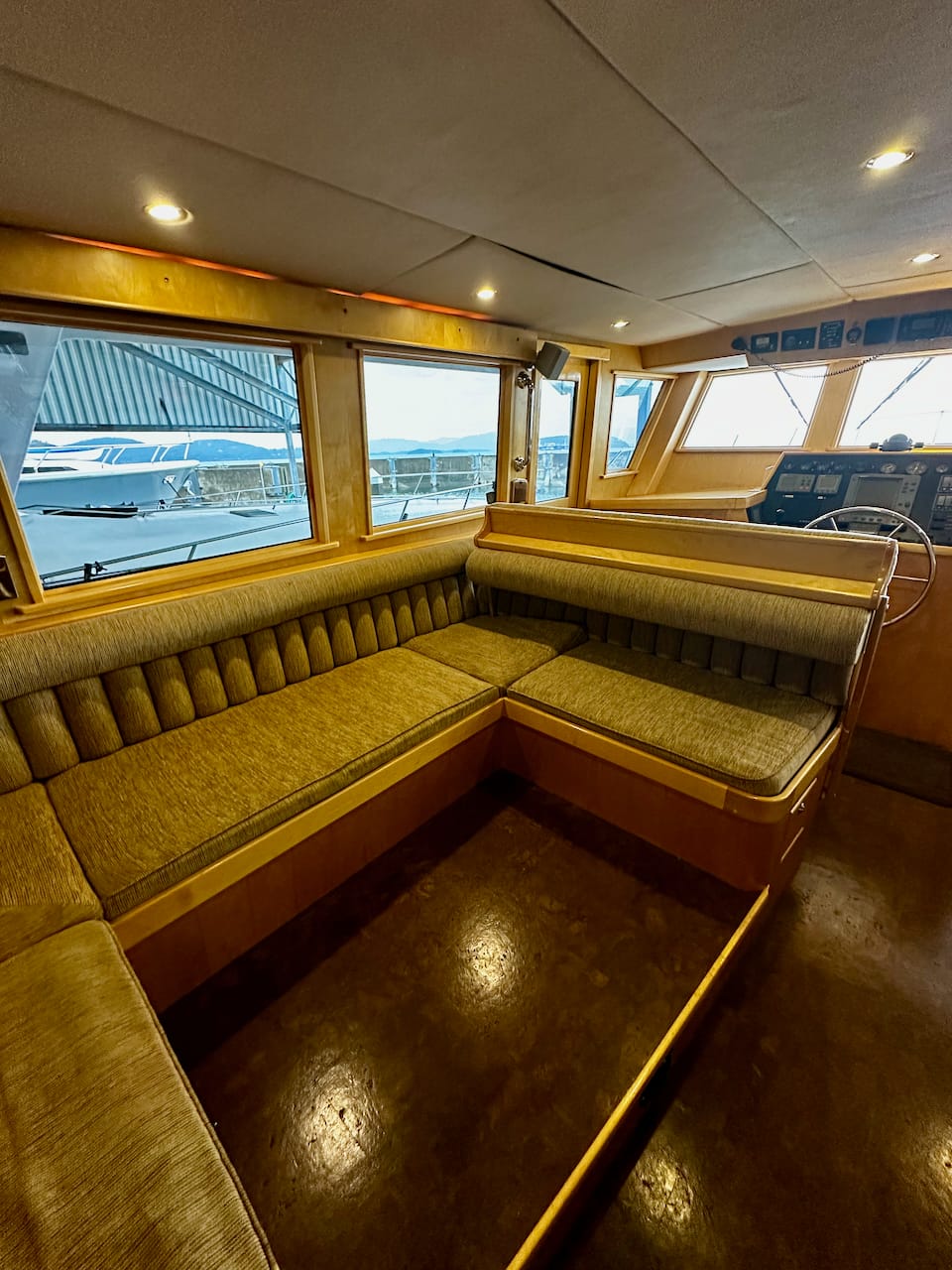 The layout of the pilot house with the salon (we're calling it lounge) is a favorite part of the boat for me. I love how people could be hanging out in the lounge while underway and essentially be in or adjacent to the pilot house, and it's not a small settee area, it's a great place for everyone to hang out. We need to add a high/low table in the middle of the seating area, but that's pretty easy.