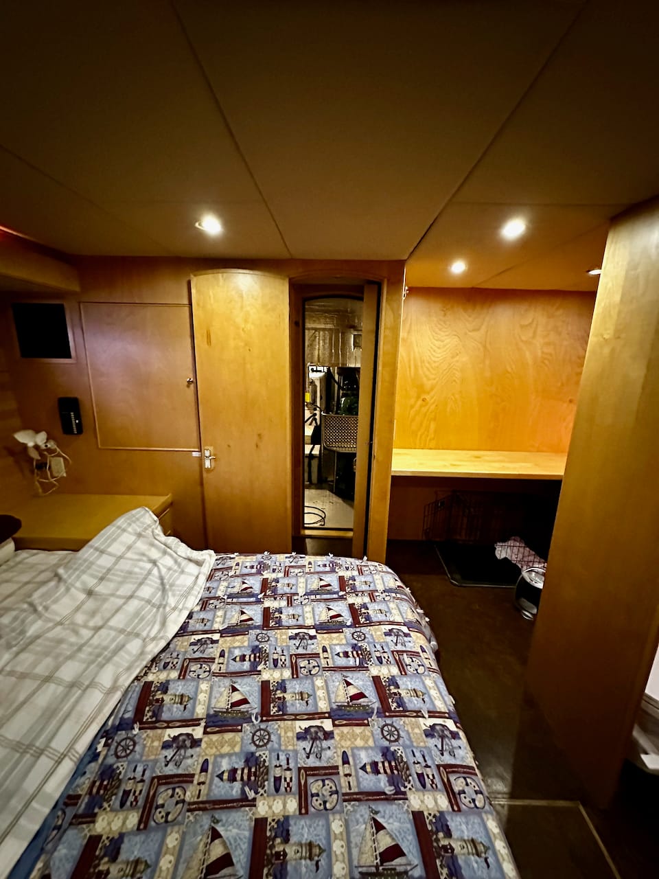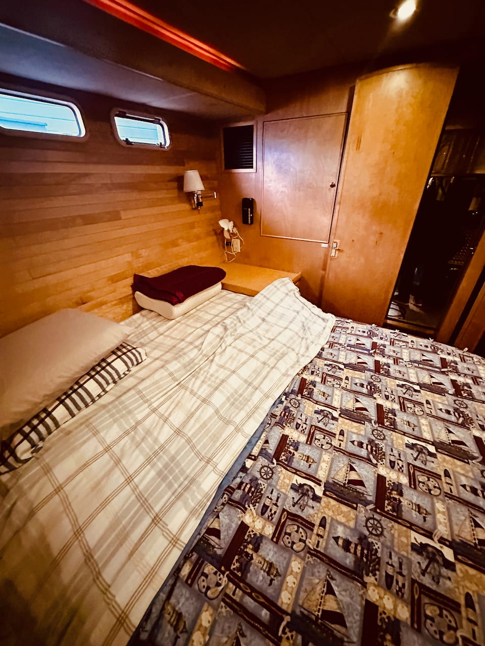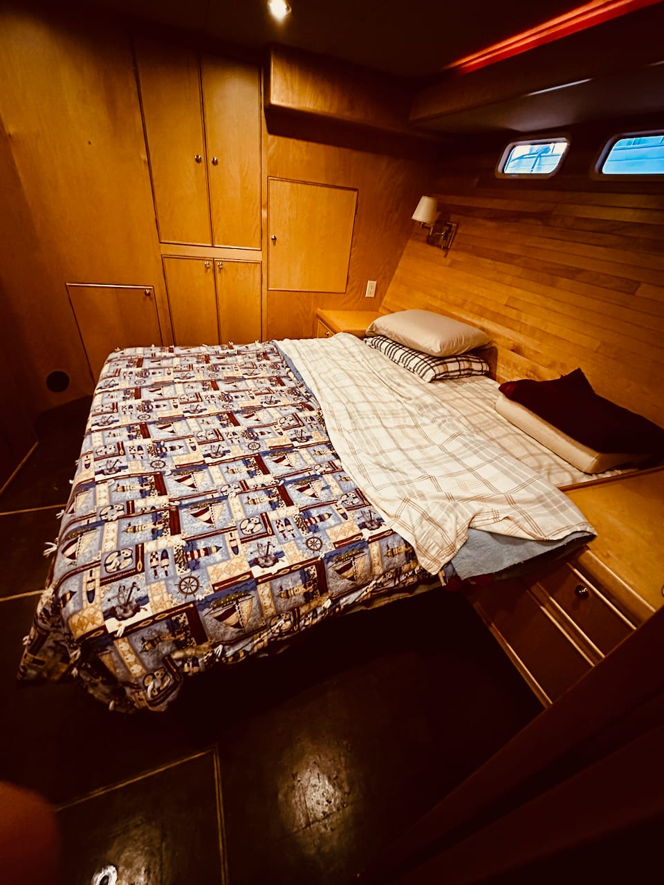 The owners cabin is a delight with very high ceilings, plenty of storage, a beautiful wood wall headboard, and a big built in desk area. These pictures are from survey, and aren't the bedding we are using, but you get the idea behind the layout. The bed is accessible from all sides without any boat yoga, and is a nice height that does not require pole vaulting to get into. The stairway to the owners cabin is separate from the other berth, which is nice for privacy.