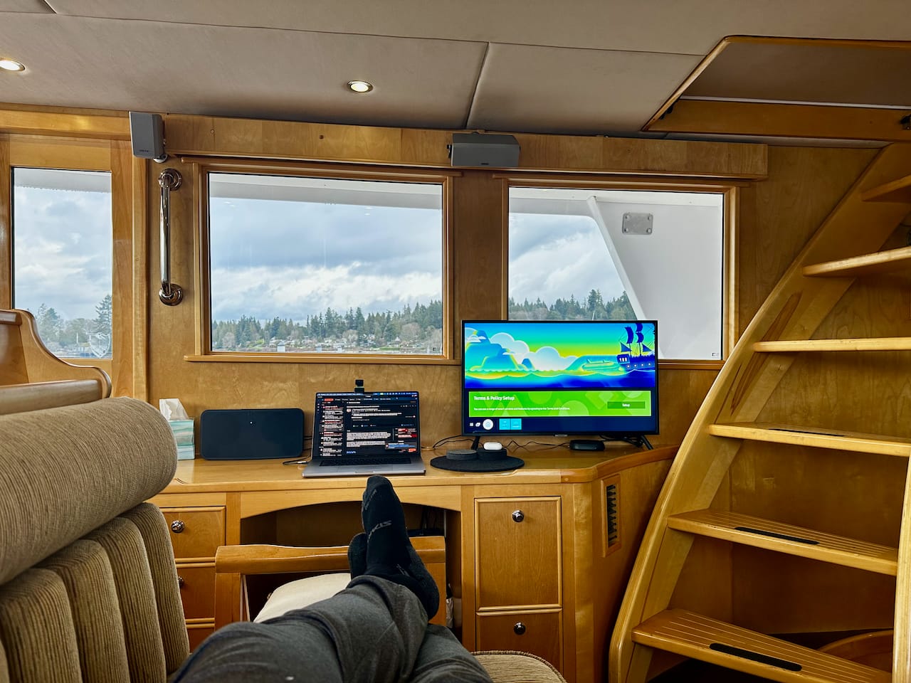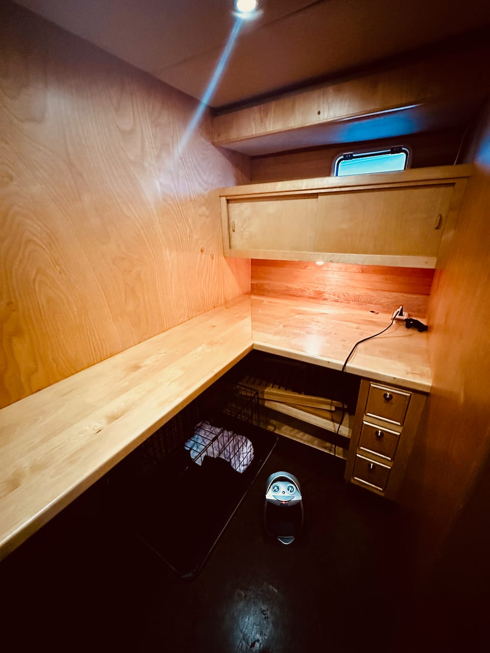 There is also a built in, beautiful desk that I'm actually using right now to write this article. It has a phenomenal view right out the side of the boat.