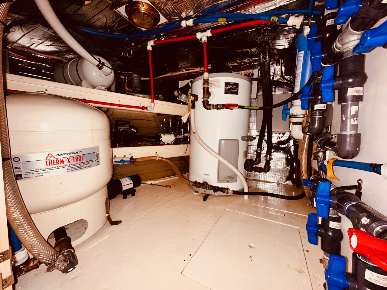 Serviceability was definitely something they thought about when building Aruna. Access to everything is pretty easy - headliners are secured with industrial outdoor velcro, and can be easily removed to access things. There are also awesome spots like the water works room that contains the hot water heater, expansion tank, all of the various pumps for fresh and sea water, vacuflush bits, valves for just about anything you can think of, and more. All easily accessible and in one place so you can work on things without running around.