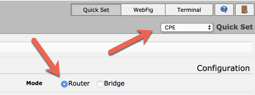 If not, using the pull down near “Quick Set” choose CPE. It may want to reboot – make sure you do that before changing anything else.
