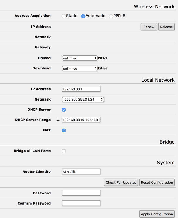 There are two ways to configure a MikroTik device – via a web browser, or via Winbox. I prefer using the browser as it works from any operating system, even an iPad, while Winbox is made for Windows. You can run Winbox on Mac or Linux if you want to go through the headache of setting up Wine, which I don’t care to do. If you prefer Winbox, these instructions may not match all steps in that interface.