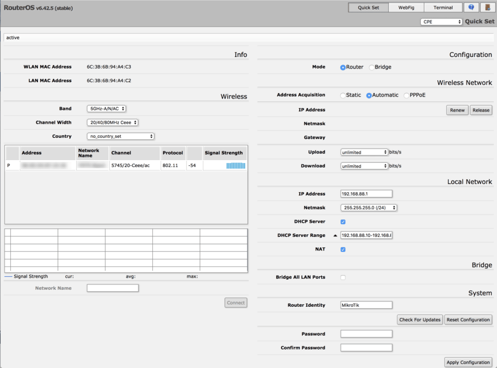 Can you elaborate on how to do this? I tried out the older model b/g/n last week and liked it, so I wanted to upgrade to the AC model but when I just unpacked mine (GrooveGA-52HPacn – with the “A”) I ran into something similar to you. It came with a WISP profile and script set up and I have no idea how to get it configured for CPE. The QuickSet menu looks nothing like this guide or the old 52HPn that I played with. I am not sure if the author here is indeed using a GrooveGA-52HPacn (with the A) or if he is using the RBGrooveG-52HPacn (without the “A”). It’s really unclear what one is buying online because no matter what these vendors put in the description, it seems they all show photos with the case labeled GrooveGA-52HPacn and while there may or may not be different models of them and they may be configured differently, at least the photos online all say GrooveGA-52HPacn. Thanks for your help … - Steve Mitchell