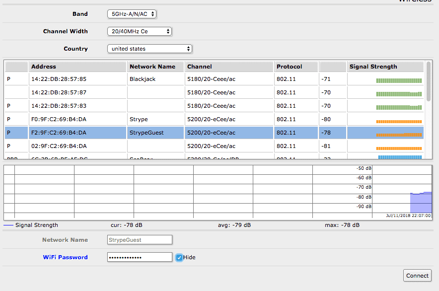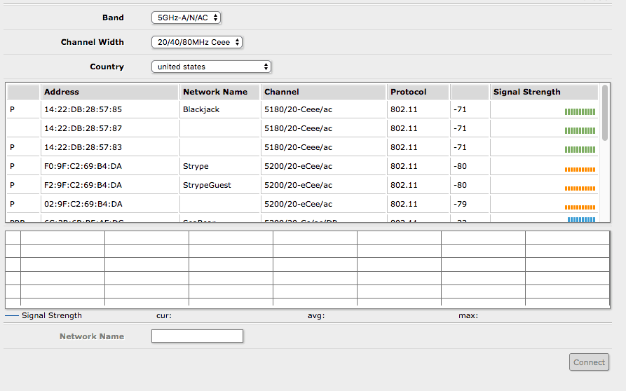 Once there, you should see a Wireless section on the left hand of the screen. By default the MikroTik should start showing you available WiFi networks, but it may be blank if the band is set wrong.