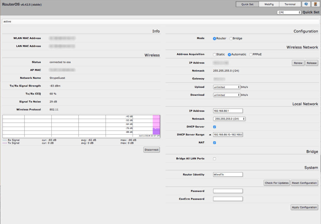 Some people have asked about Bridge vs Router mode, and why you would want another NAT in the process. NATs are not that “expensive” network-wise, and I find it easier to determine where traffic is coming/going to with clearly defined network addresses. Bridges are known to forward anything they receive, and in a WiFi situation, I don’t want crappy broadcasted traffic forwarded through the MikroTik down to my router.