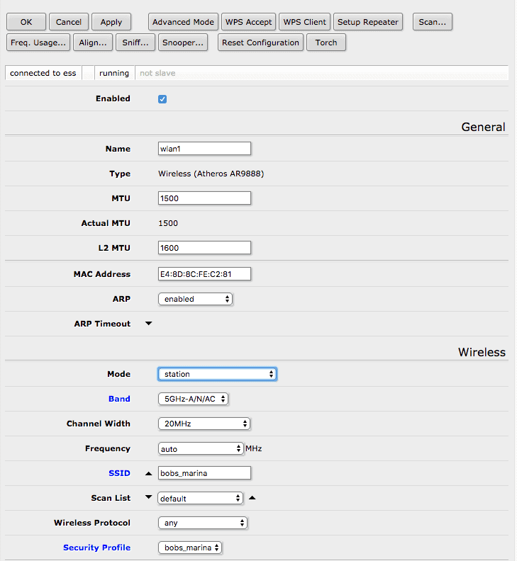 While you are now connected and should have Internet access, some versions of RouterOS record the exact access point MAC address, band and channel width and locks the connection to those properties. If you are at a location where there are multiple access points (APs) providing the same WiFi signal, you may wish to override that so that the Groove searches for and uses the most powerful access point if something changes.