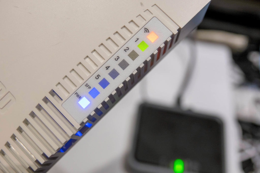 MikroTik hAP AC lights showing WiFi active and Ethernet port 1 connected