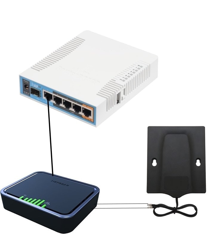 This is the full featured solution with both LTE and WiFi internet sources available. Port 1 on the MikroTik hAP router connects to the Netgear for LTE internet access, and port 5 connects and powers the MikroTik Groove via power over ethernet (PoE) to capture remote WiFi signals.