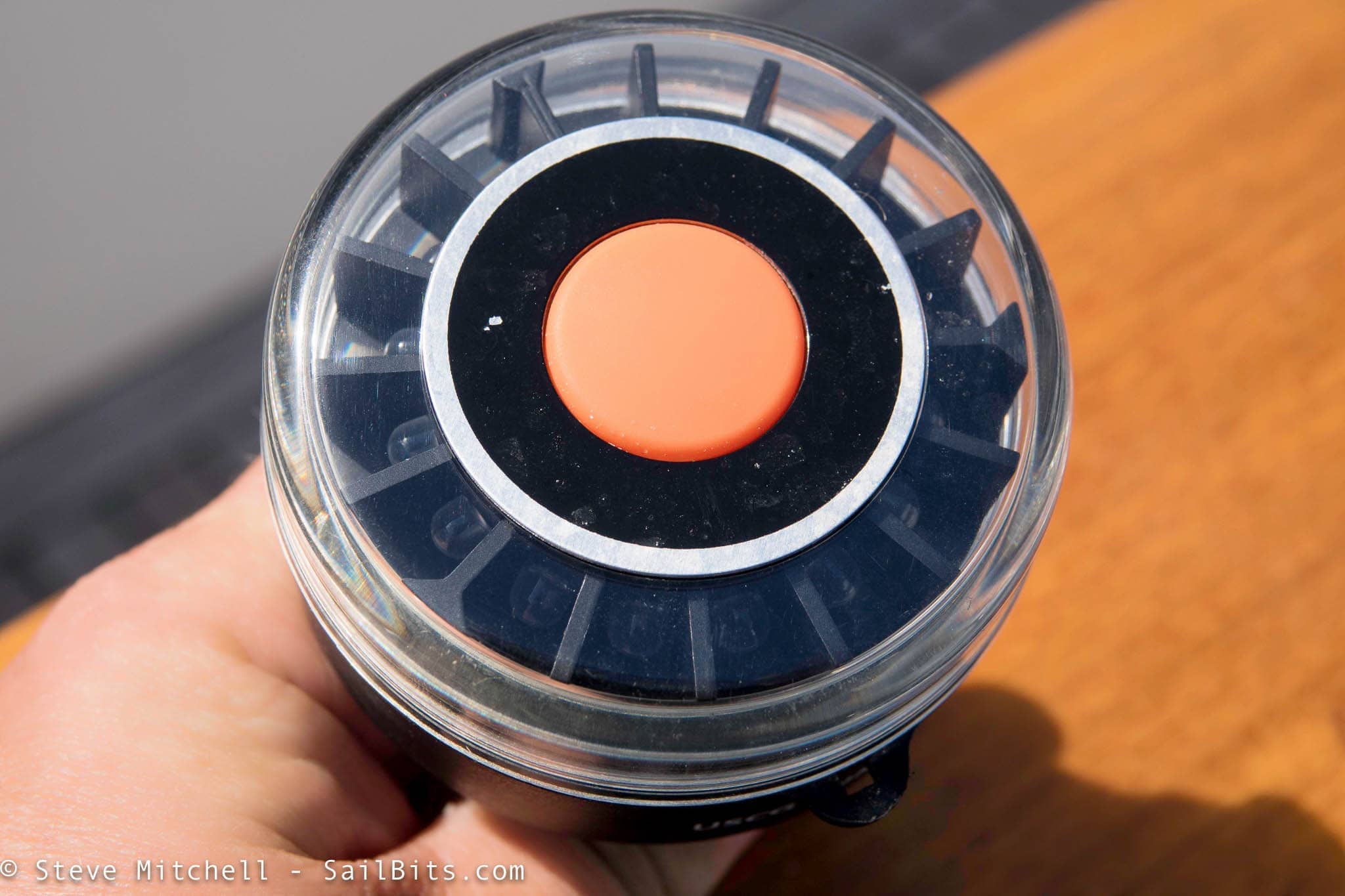 There are 16 LEDs in each light that are extremely bright. A nice big orange power button is on the top of the light – easy to see even at dusk. The above light is the bow / tri-color version, and you can see the plastic separators are a bit wider at those points where the light color changes.