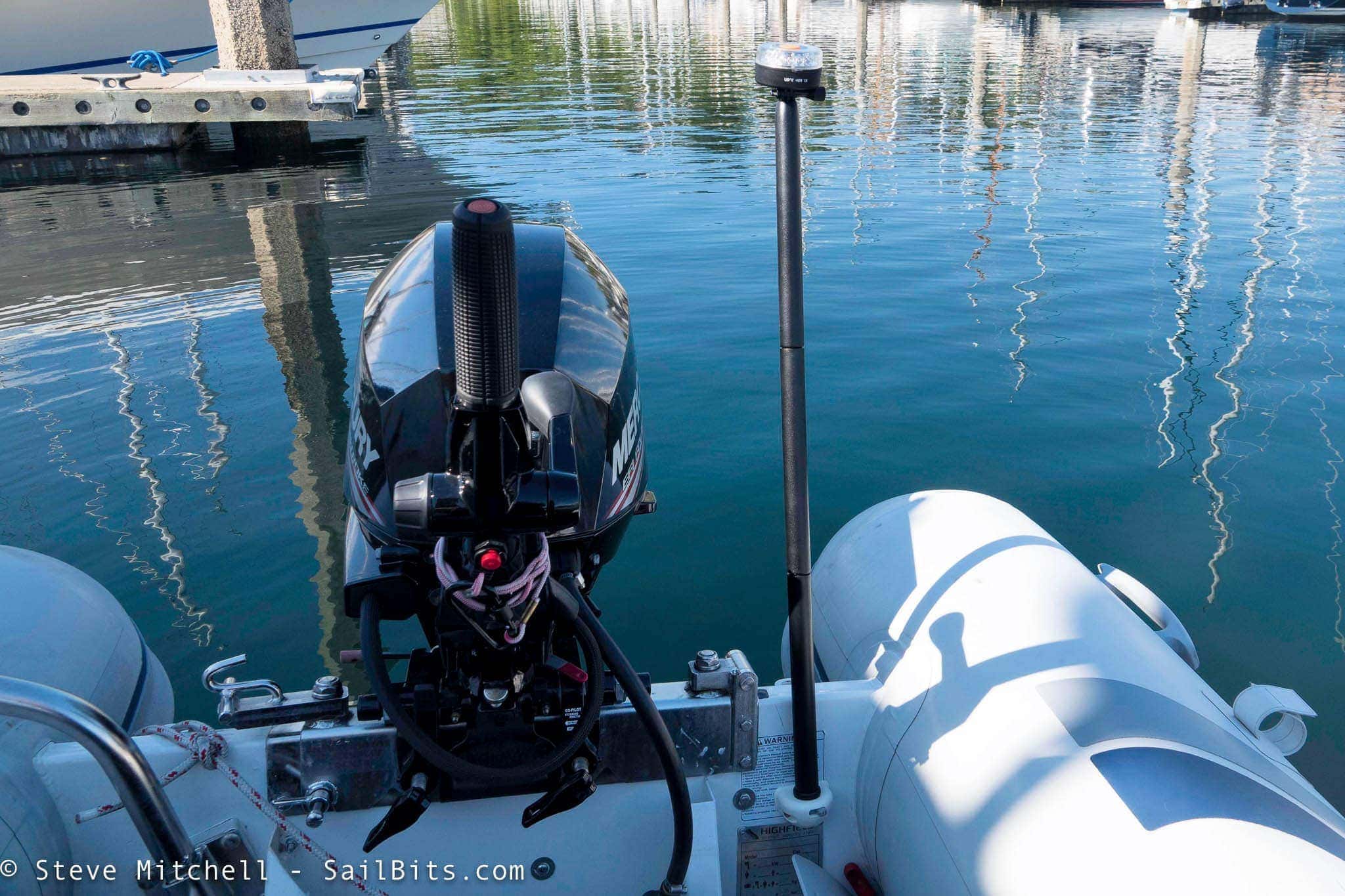 I don’t generally use the storage box unless the dinghy is put away for a long while. Instead, I leave the bow light in the mount during the busy season, and the stern light I store in a bag aboard the dinghy. I don’t like leaving it installed since it is tall and can get in the way.