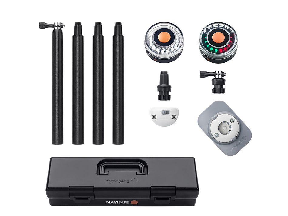 This kit comes with two lights, mounts for both bow and stern, poles for the stern light, and a storage box. The lights are specific – one is an all around white light that would be used on the stern of the dinghy, and the other is a tri-color light which would be used on the bow.