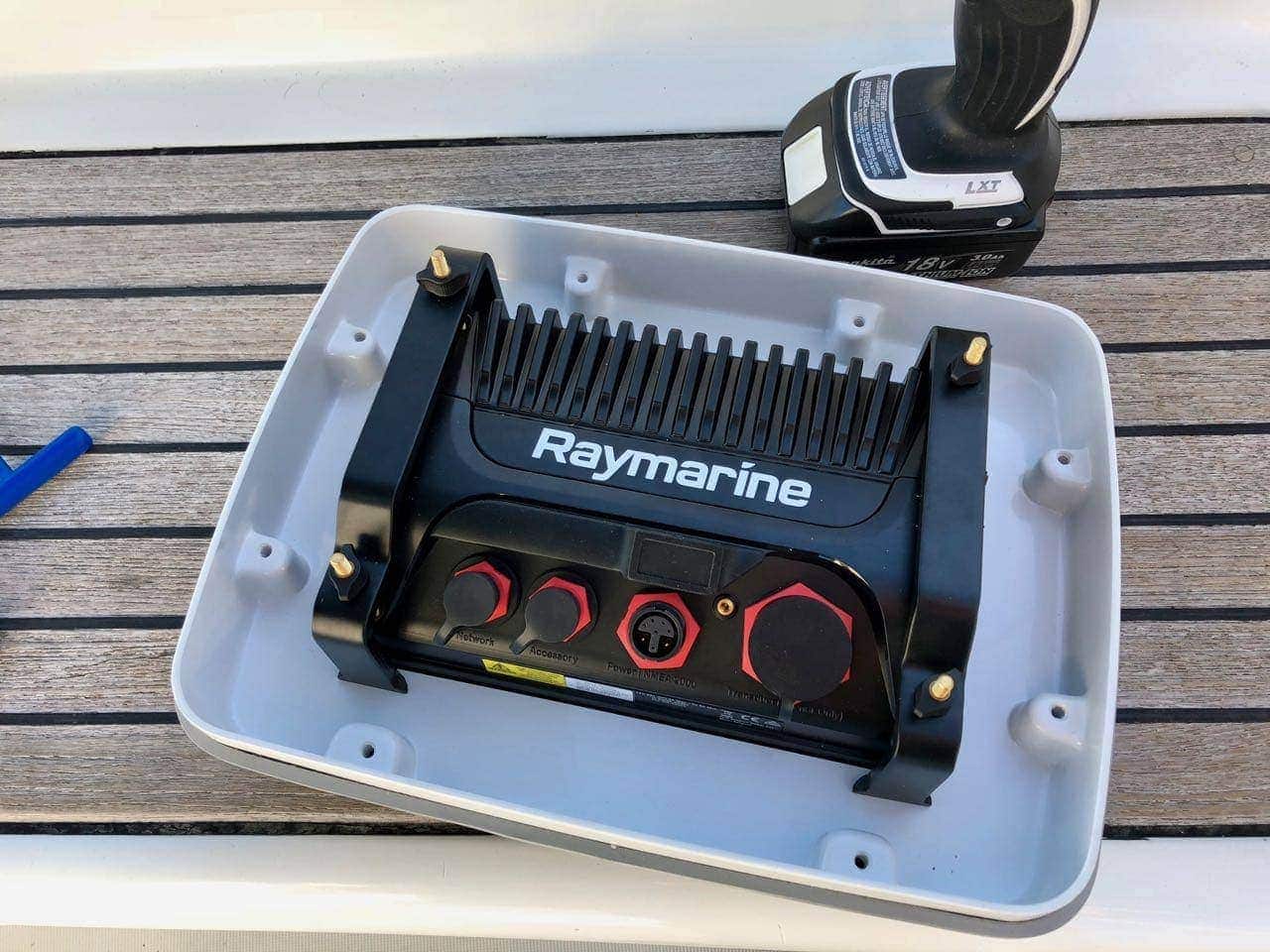 Mounting the Axiom was pretty painless. The hole was pre-cut, which I highly recommend – I’ve tried cutting holes in this material, and you have to have patience and make sure you don’t get your blade too hot, or things will melt weirdly. Plus, nothing I have ever cut in my life ends up straight, and the folks at Ocean Equipment have far better equipment to make beautiful, clean cuts with just the right amount of space. The Axiom has brackets that attach to the back of it and slide over screws that can be tightened down quickly and easily. No holes or screws from the front of the unit required, which is a nice change from many other manufacturers, including older Raymarine kit.
