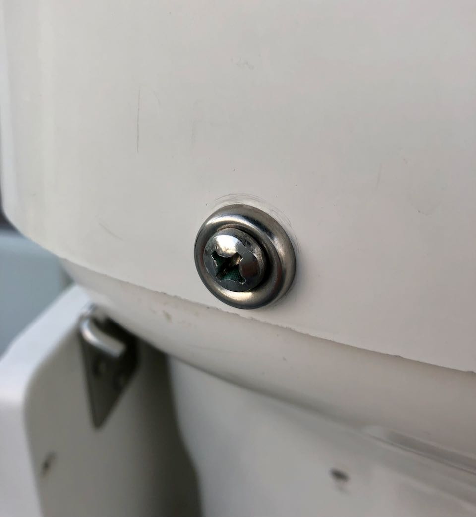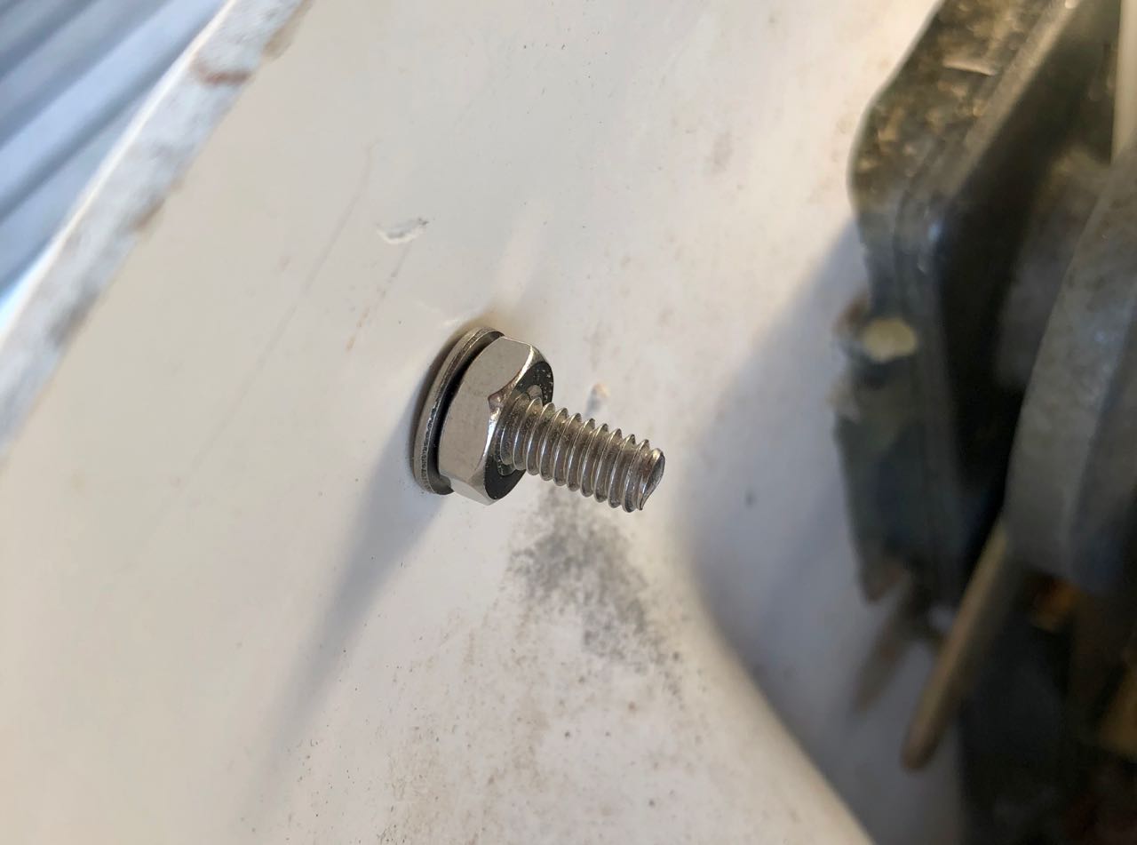 A nice wide inset washer hides the hole from the previous setup, as well as provides some additional coverage and strength. Now I can get in and out of the top of the helm station easily.