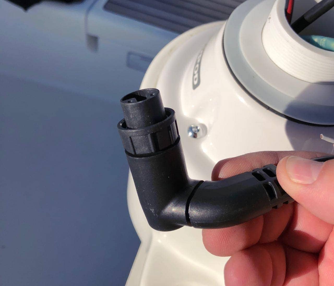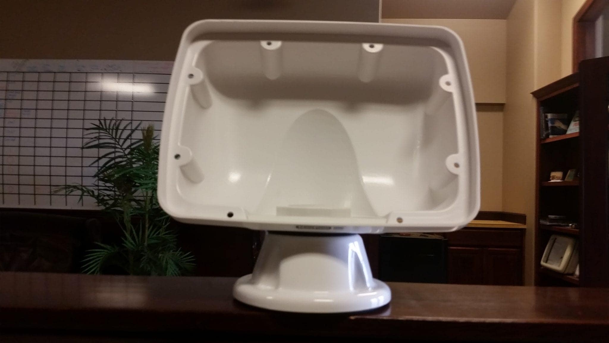 The unit arrived quickly, and after removing the compass, I started my install. I removed the big plastic nut that held the base to the upper section, and installed it using the four provided security screws directly to the opening left by the compass. I reinforced underneath the edges with a 3″ thick wood criss-cross structure that allows the screws far more to bite into, and prevents any side to side movement. Pulling the wires up through the base was super easy, even through the wood structure.
