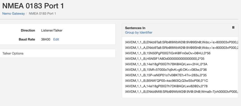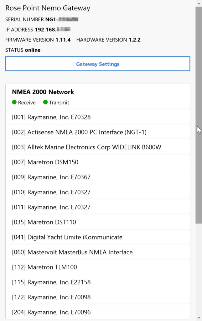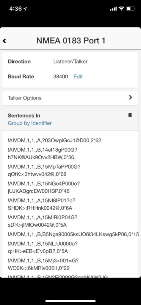 Similarly, NMEA 0183 also shows all of the sentences coming into the gateway. Above, you can see my VHF radio sending AIS data into the gateway. In the case of NMEA 0183, sentences aren’t decoded, but having lived in that world for years, I know that AIVDM are AIS target updates from various ships. Most helpful with 0183 is the fact that you can see data flowing through, knowing that you got your wiring correct, and that baud rates at both ends are setup correctly.