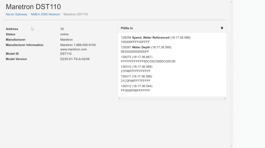 Here’s another example showing my Maretron depth, speed, and temp sensor. You can see the identified PGNs that the Nemo has highlighted in bold, and the data changes as fast as it is coming through the gateway, which shows you that things are working / being transmitted.