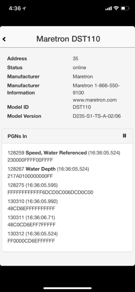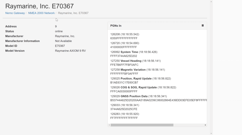 Here’s where my geek gets even more excited – the amount of data, presented in a usable fashion, without complex PC programs or debug stuff, is simply excellent. You can see above my Raymarine Axiom chart plotter and all of the types of data it is sending. The data itself is not decoded, as I suspect that would require a lot of custom formulas and conversion, but I can see that the chart plotter is sending what I would expect it to send.