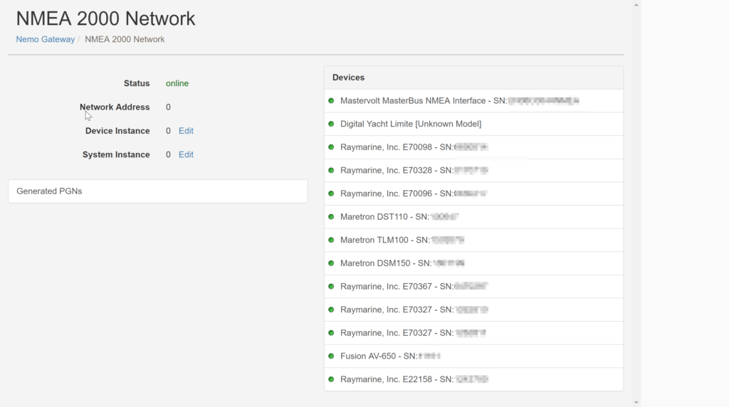 The NMEA 2000 Network detail page shows all of the connected devices on your network and their status indicated by a little dot – whether they have been active on the network recently. This has been great when I have been hacking on my network to make sure everything is still powered up and connected.