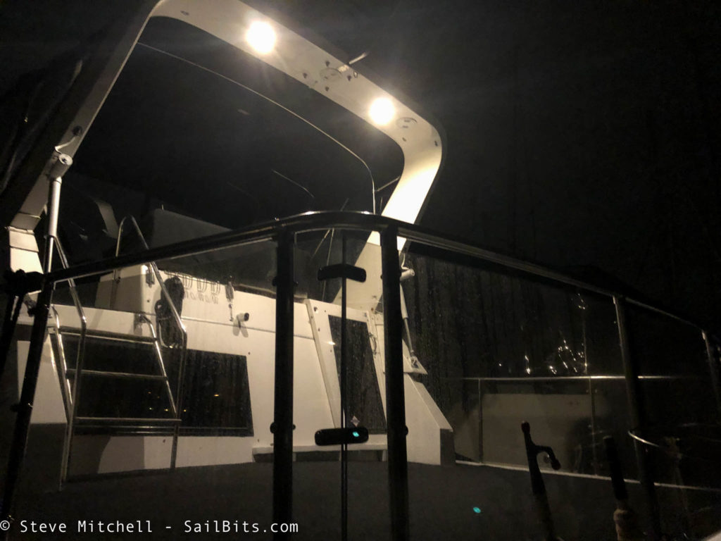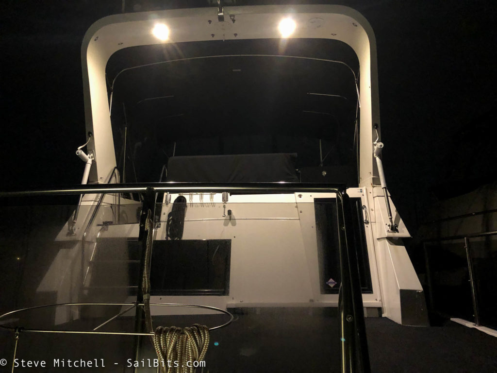 The light not only lights up the sun deck, but even more of the flybridge, and the steps up from the cockpit.