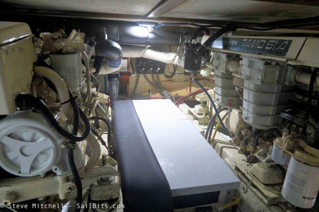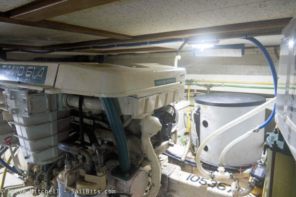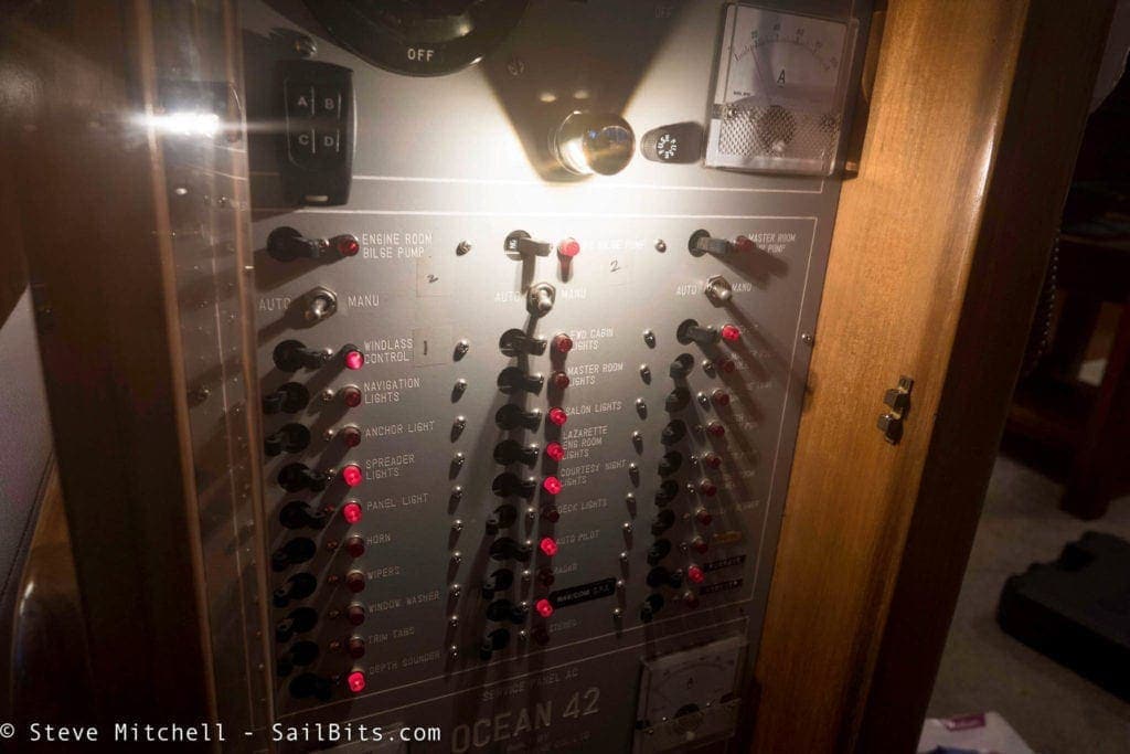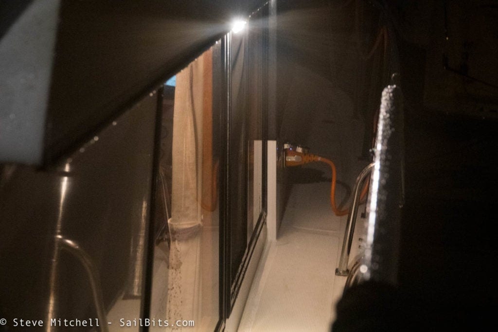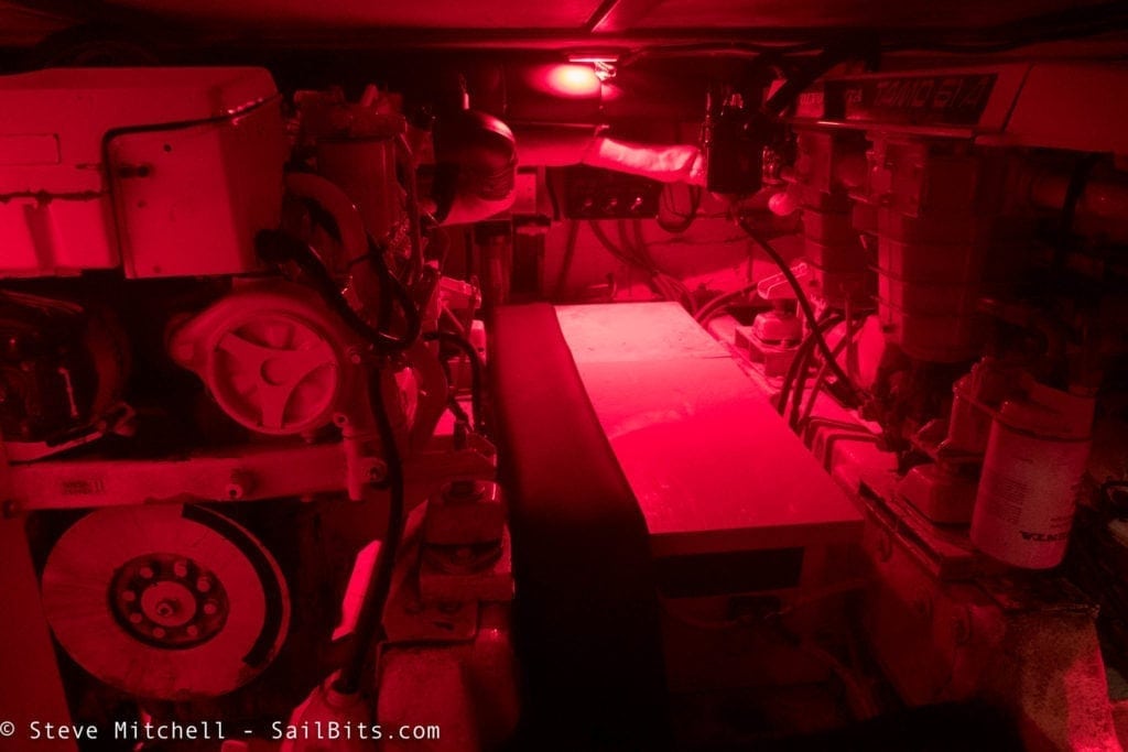 The engine room lighting was a disaster lighting-wise. There were three more of the 6″ chrome all purpose lights, two of which did not regularly work. There were also two AC-only fluorescent lights on either side of the engine room which gave some light, but burned a lot of power. It was very dark pretty much anywhere.