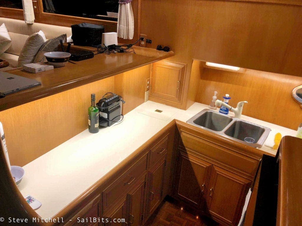 In the galley we had a bit of a mess. There were wires hanging down over the prep area with a single LED light that was not really bright enough. Over the sink and stove there were compact fluorescent lights, probably original to the boat, and while they gave off more light than the LED fixture, they sucked a lot of power, and still weren’t that bright. I also don’t like how my food looks under fluorescent lights!