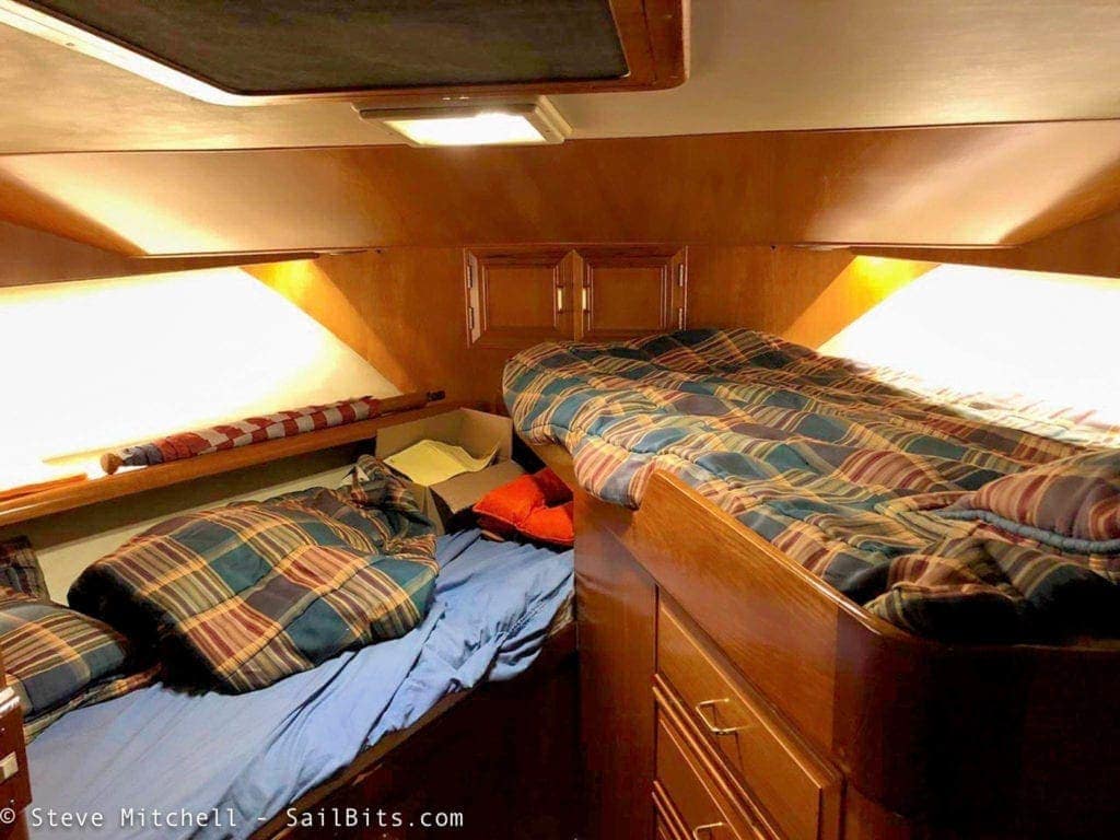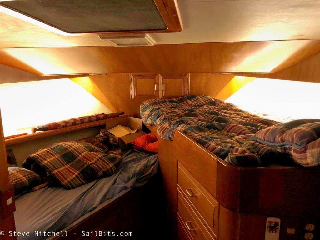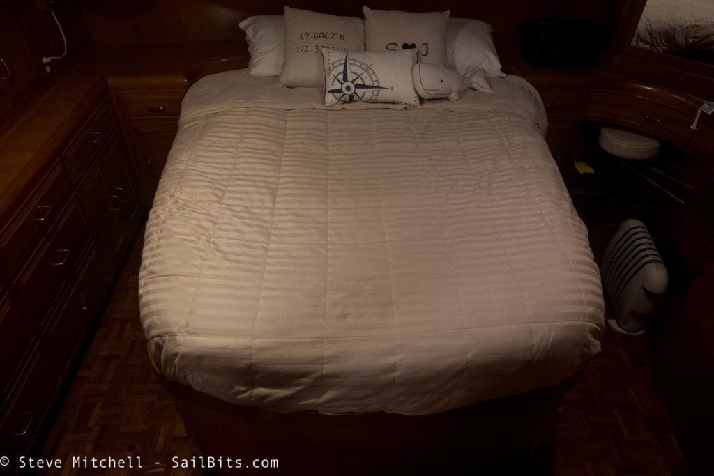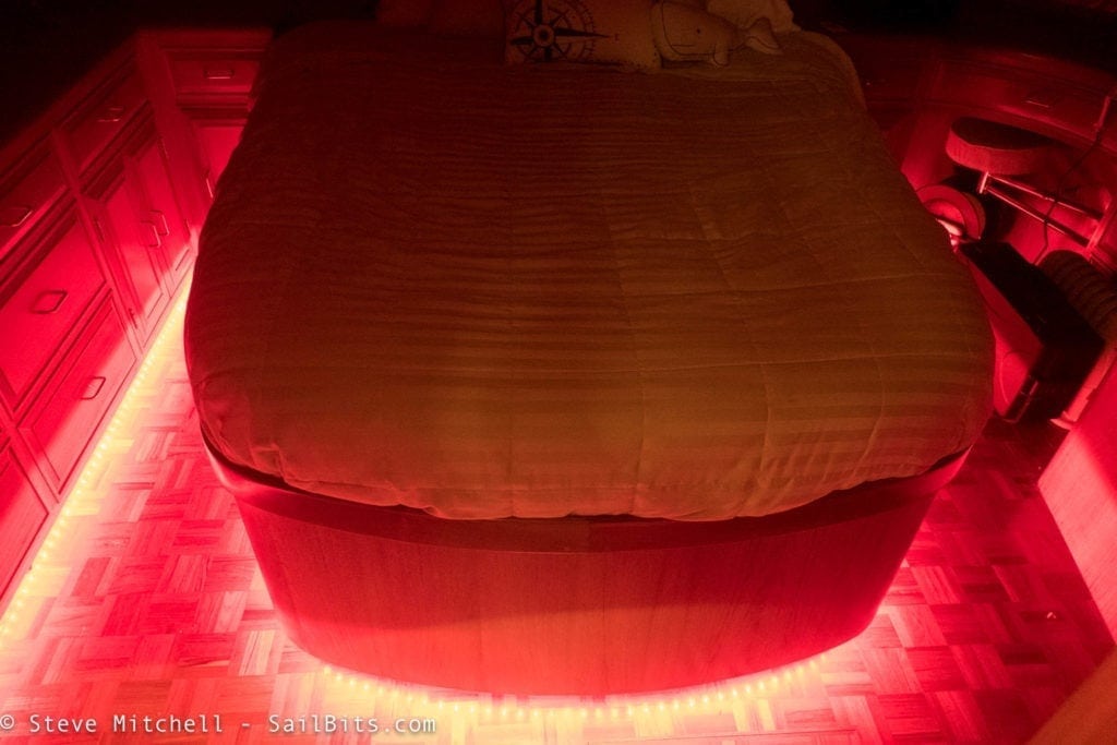 The master had a set of the red courtesy lights under the cabinets and entire bed structure and around the far corner. Turning these on drew 10 amps, so they definitely needed to be updated! I didn’t even know the boat came with them until I found a switch on the left hand side of the bed under the covers, but they are super helpful at night.
