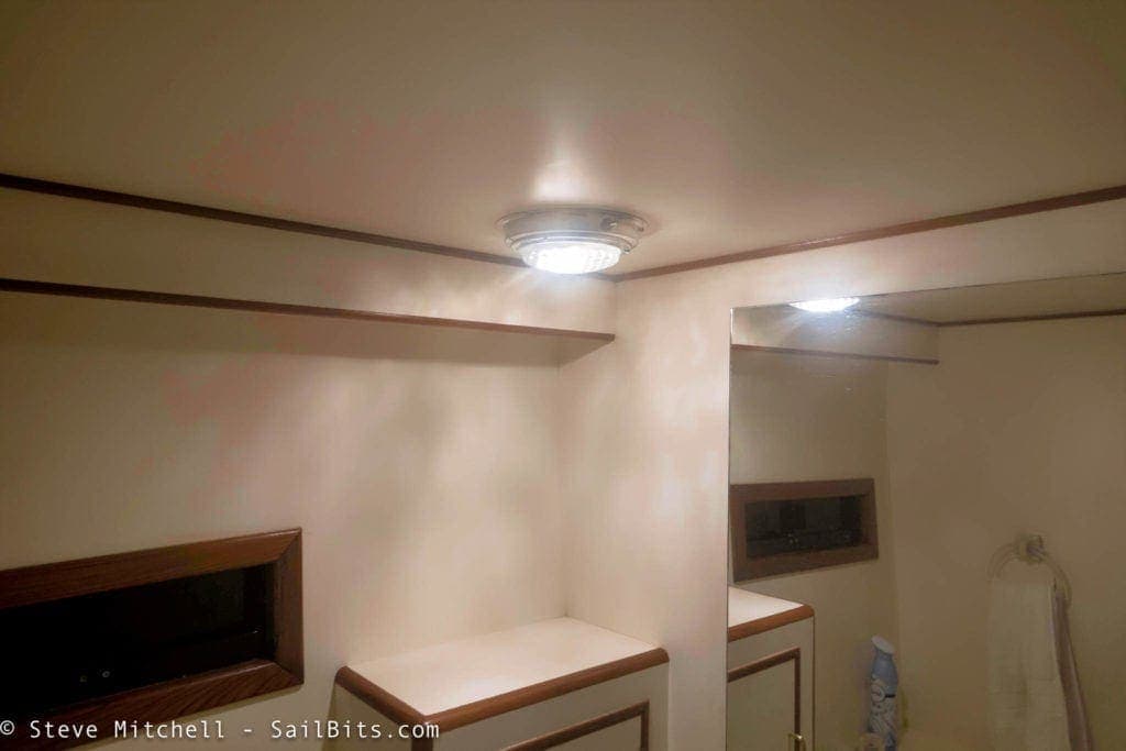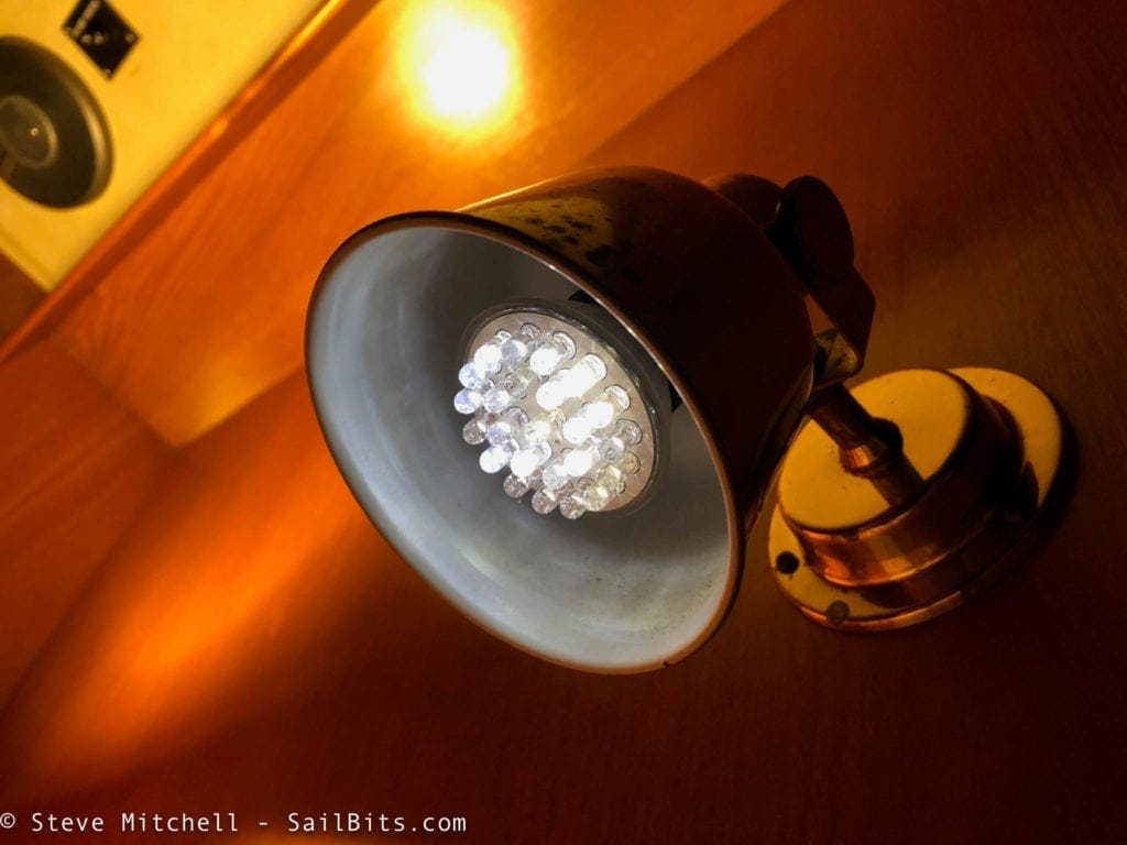 The guest stateroom had the same challenges as the master – overhead square fixture, red courtesy lights that ate power, and reading lights. In this room, though, there were still old 12v incandescent screw in bulbs in the reading lights, which were upgraded using the same Marinebeam replacement as the master.