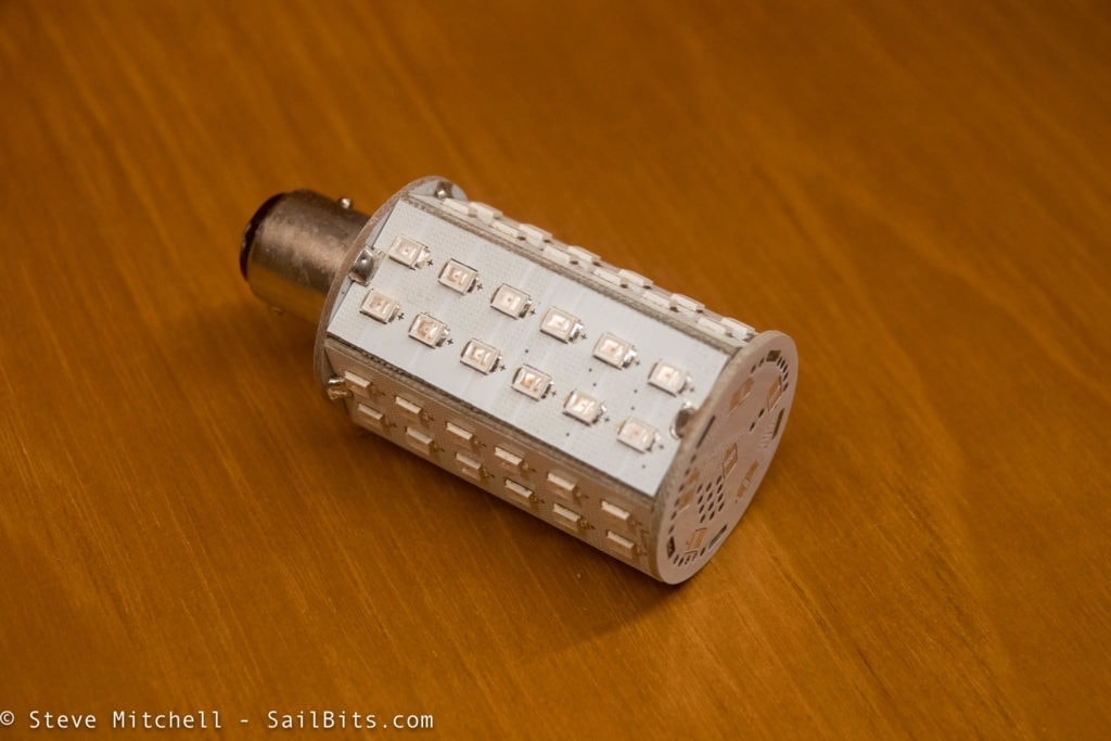 For the port and starboard lights, I chose the matching red/green LED light bulb. Most manufacturers will warn you not to use bright white bulbs, but instead use ones matched to the lens color.
