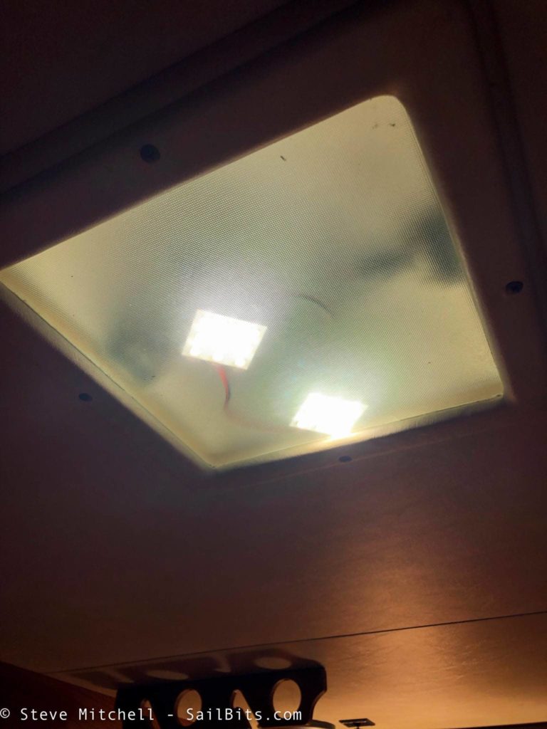The overhead lights were relatively easy to update. The fixtures have two bayonet sockets on either side of the square glass in front of them, and the previous owner had put in LED square retrofits, but they were a very blue/cool white color, which I find harsh, and were also sitting on the glass and not attached, which meant you could really see the LEDs, and they moved around as the boat moved.