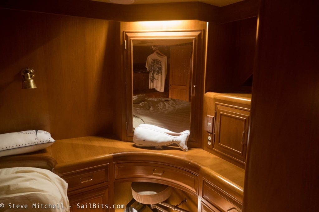 This room had a few lights – overhead squares like the salon, courtesy lighting under the bed and cabinets, and a vanity light.