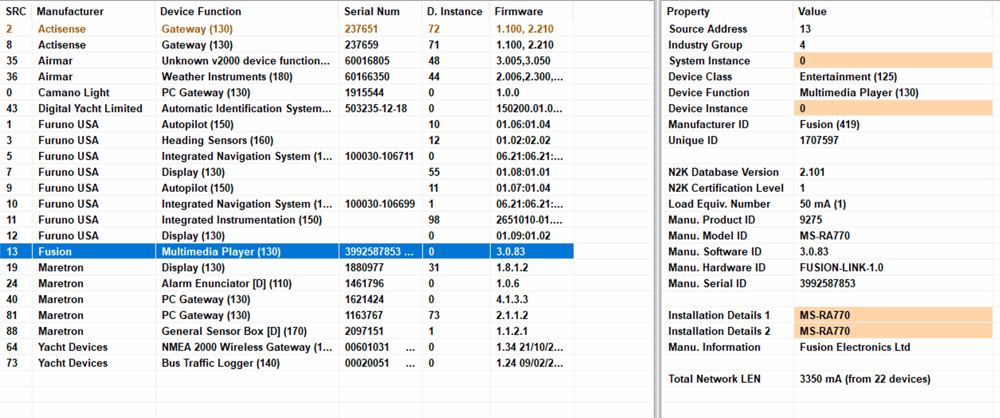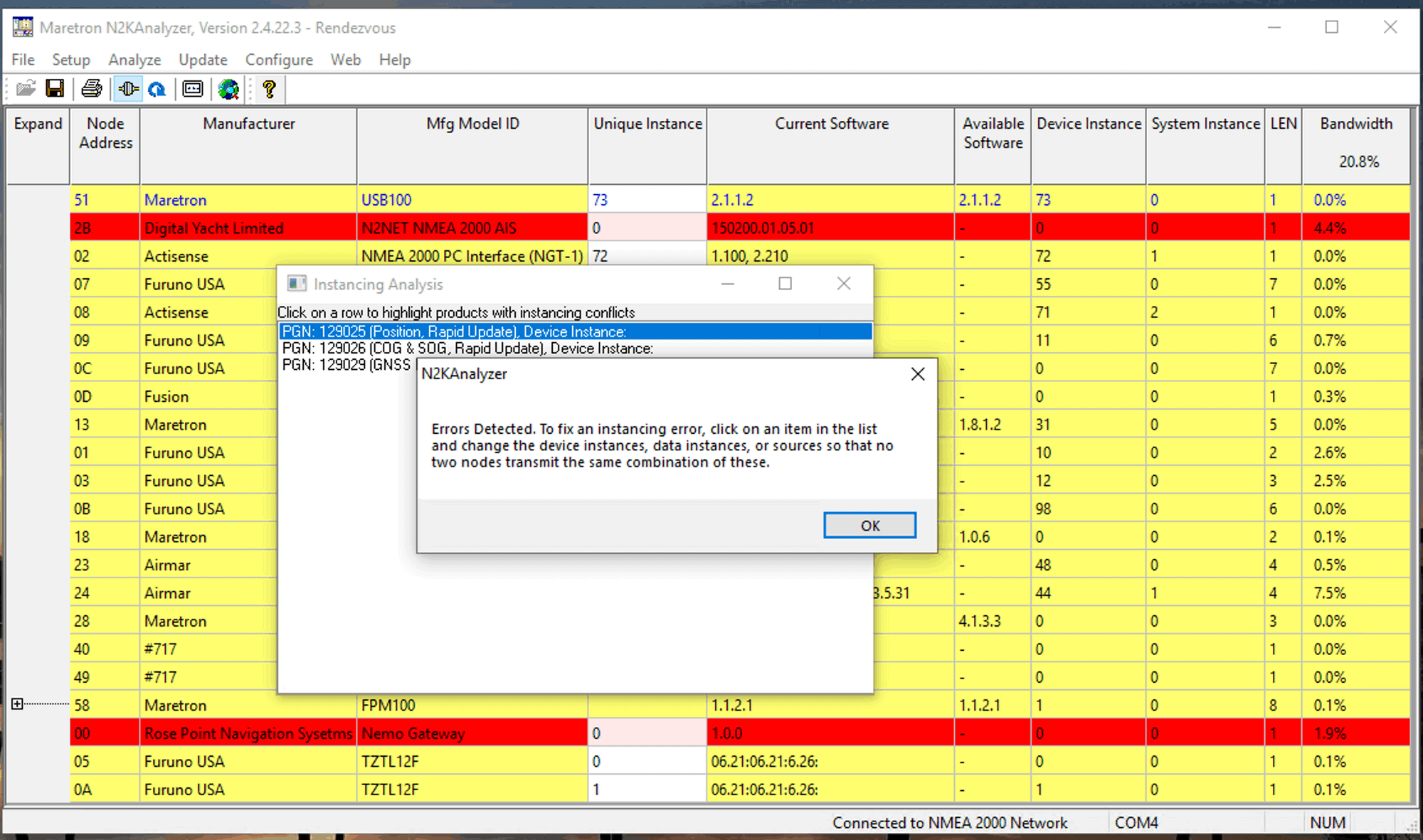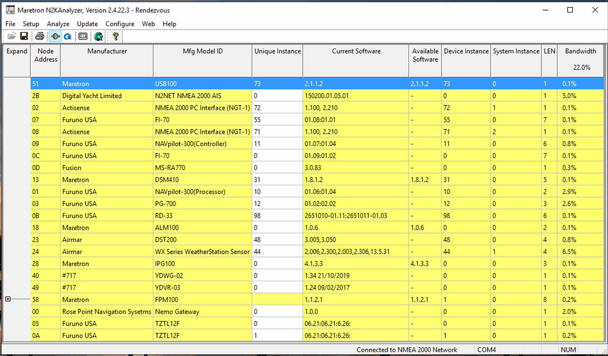 N2KAnalyzer is usually the first tool I start up to check on my network if I think there is an issue. The main screen is a nice compact list of all devices, software versions, instances, and bandwidth currently consumed on the N2K network by each one. It makes it very easy to see if something is missing or if something is going haywire and flooding the network.