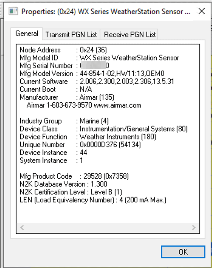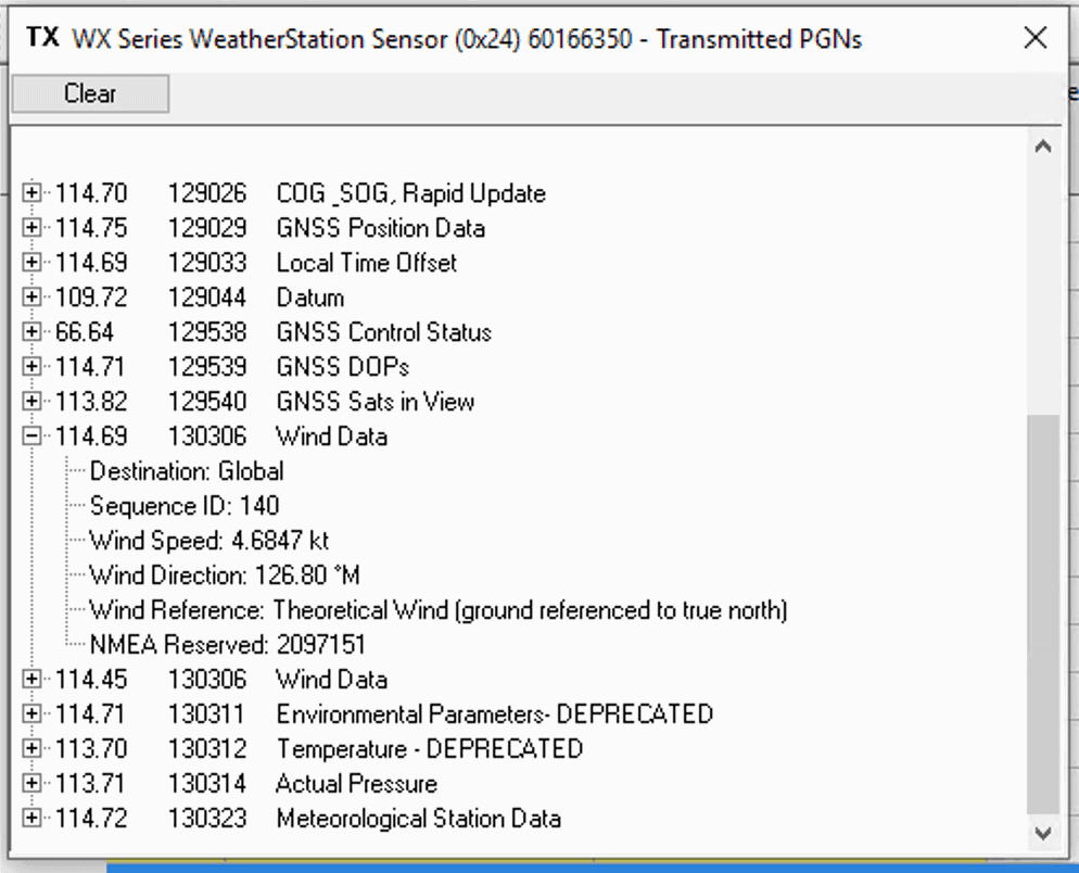One of the main reasons I use N2KAnalyzer is its display of both received and transmitted PGNs. Above is my Airmar WX220 and I can drill down into each PGN and see what data is currently being sent. Super useful to figure out where a problem might be.