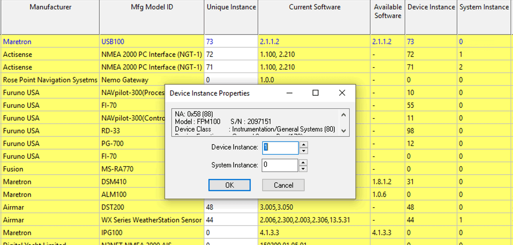 Changing instances is super easy in N2KAnalyzer, and can be done with a pop-up like above, or you can also just type into the Unique Instance column and set things all up and down the list very quickly.