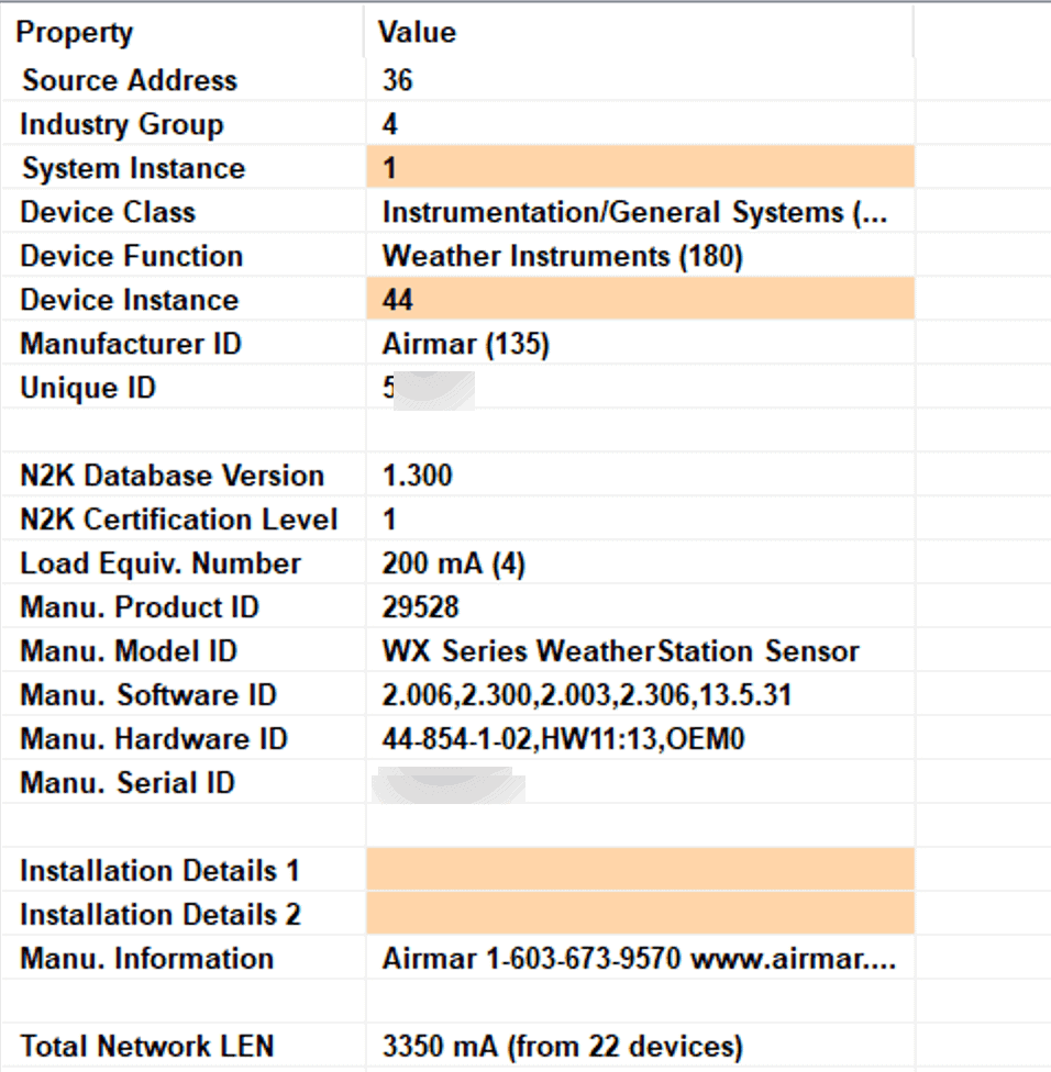The tabs below allow you to cycle between the PGN details and the properties of the device sending it, which is very useful as well. You can change instances here, as well as see the overall power usage (Total Network LEN) for your NMEA 2000 network.