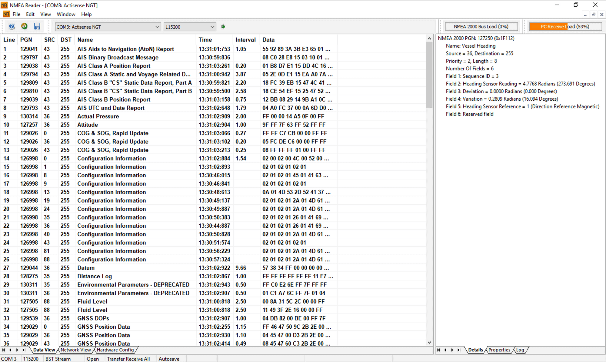 Clicking on a row shows the data for that particular PGN updating real time.
