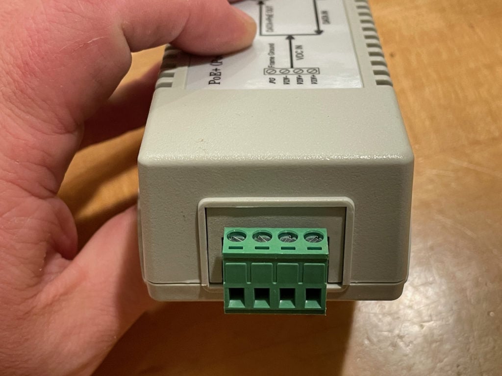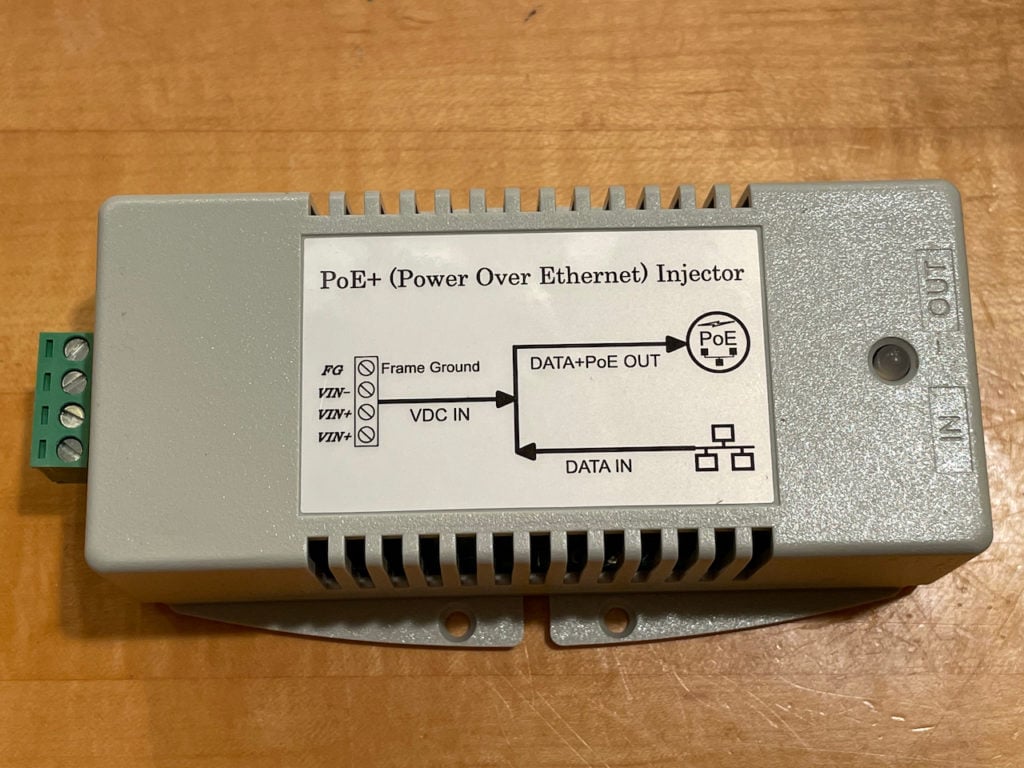 These injectors have a wire block to connect to your DC power source (make sure you add a fuse!) and two ethernet ports on the other end. One ethernet port goes to the device to be powered, and has PoE power coming out of it, and the other port is to go to your router, switch, or other device that the device is attempting to connect to network-wise.