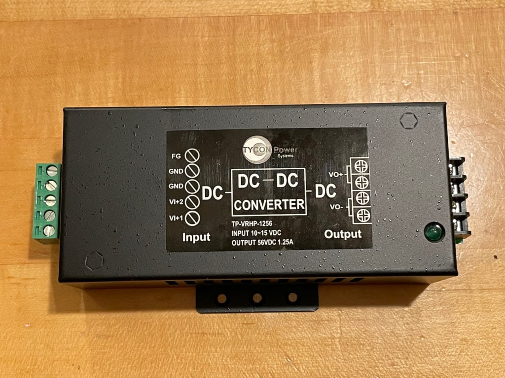 My preferred solution is from Tycon, who have been around a long time in the solar and carrier world – I've used products from Tycon in my solar experimentation back into the 1990s. Their TP-VRHP-1256 is perfect to convert 12v to 56v for the various devices that need it. It's a very well built unit with decent output, a big indicator light, and clear labeling.