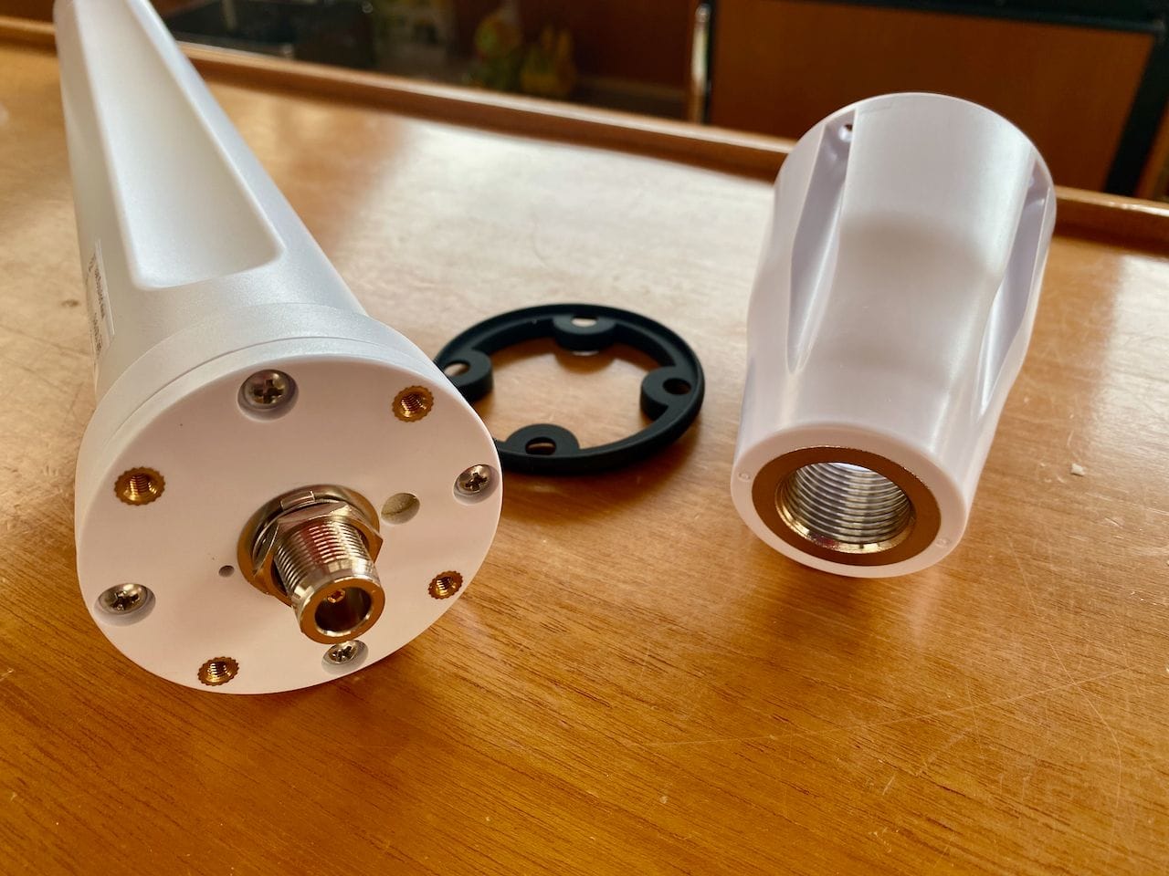 One of the reasons I love Poynting antennas is their well thought out marine mount. For the 496, you have the piece on the right which will screw onto a standard 1-1/4″ marine mount. Then, you can feed the cable up through it, attach that to the antenna, and using the rubber washer in the middle, screw up into the bottom of the antenna to firmly attach it in a waterproof manner. Their LTE antennas have the same mounting setup. This prevents you from having to rotate an antenna with a cable connected to it, or some other nonsense that invariably puts strain on the cable, or worse.