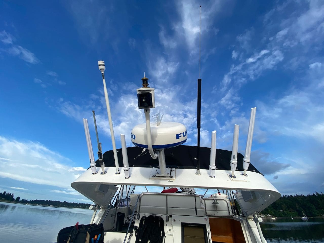 The arch on Rendezvous tips down, originally to allow the boat into a covered slip, but it comes in handy when needing to access all of my antennas. I chose to mount the OMNI-496's on either side of the radar nearer the center of the boat.