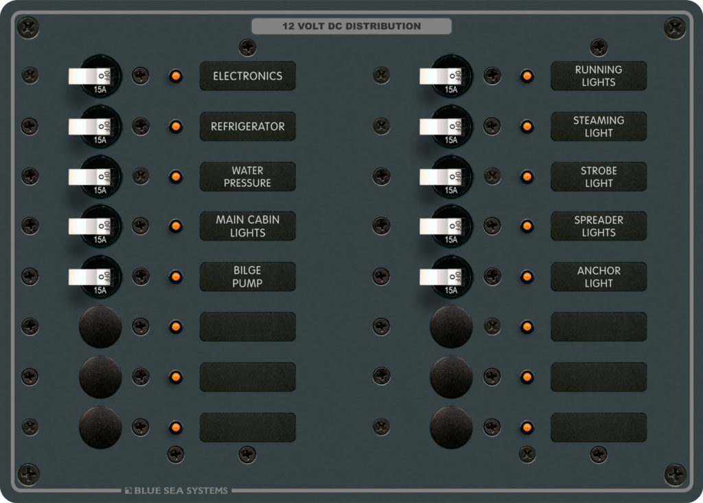 BlueSea is one of my favorite manufacturers. I have used their stuff everywhere for years, and love it. I prefer their 360 panels, and installed one on Jammy that worked perfectly for the years I owned her. There is a 16 position 12v panel that would be great for everything I have now, plus expansion. It is more compact than the Traditional Panel below, and does not have extra busses wired on the back which I don’t need.