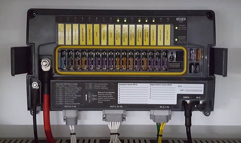 CZone has a product called the Combination Output Interface, or COI. It is a beautiful little box that has 4 high current and 12 low current outputs, 8 analog inputs, NMEA 2000 network connection, and a connection to a manual switch box. This would allow me to eliminate the DC panel itself to save room, and have a lot more freedom and control over the system from around the boat or even remotely via the NMEA 2000 connection.