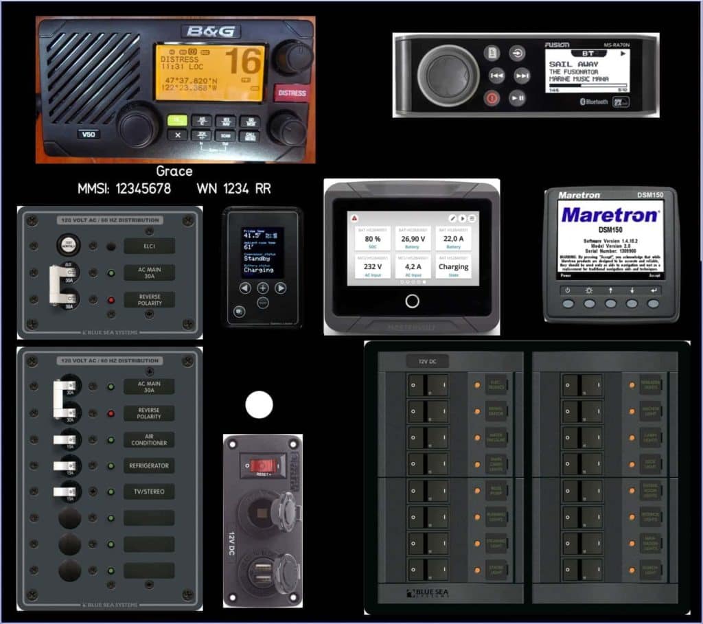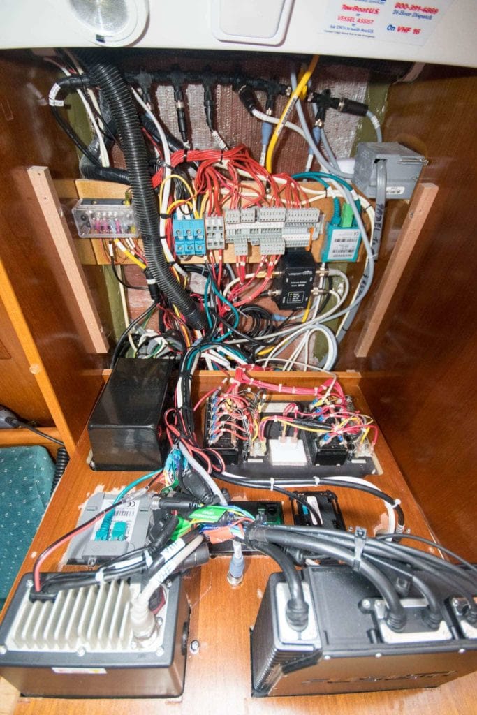 On my Hunter 326, the nav radio is near the companionway (with a remote mic at the helm). This has never been a problem for me. For some monitoring devices, such as the PV power system, they’re mounted on the side of the Nav station, vs. in the main panel wall.