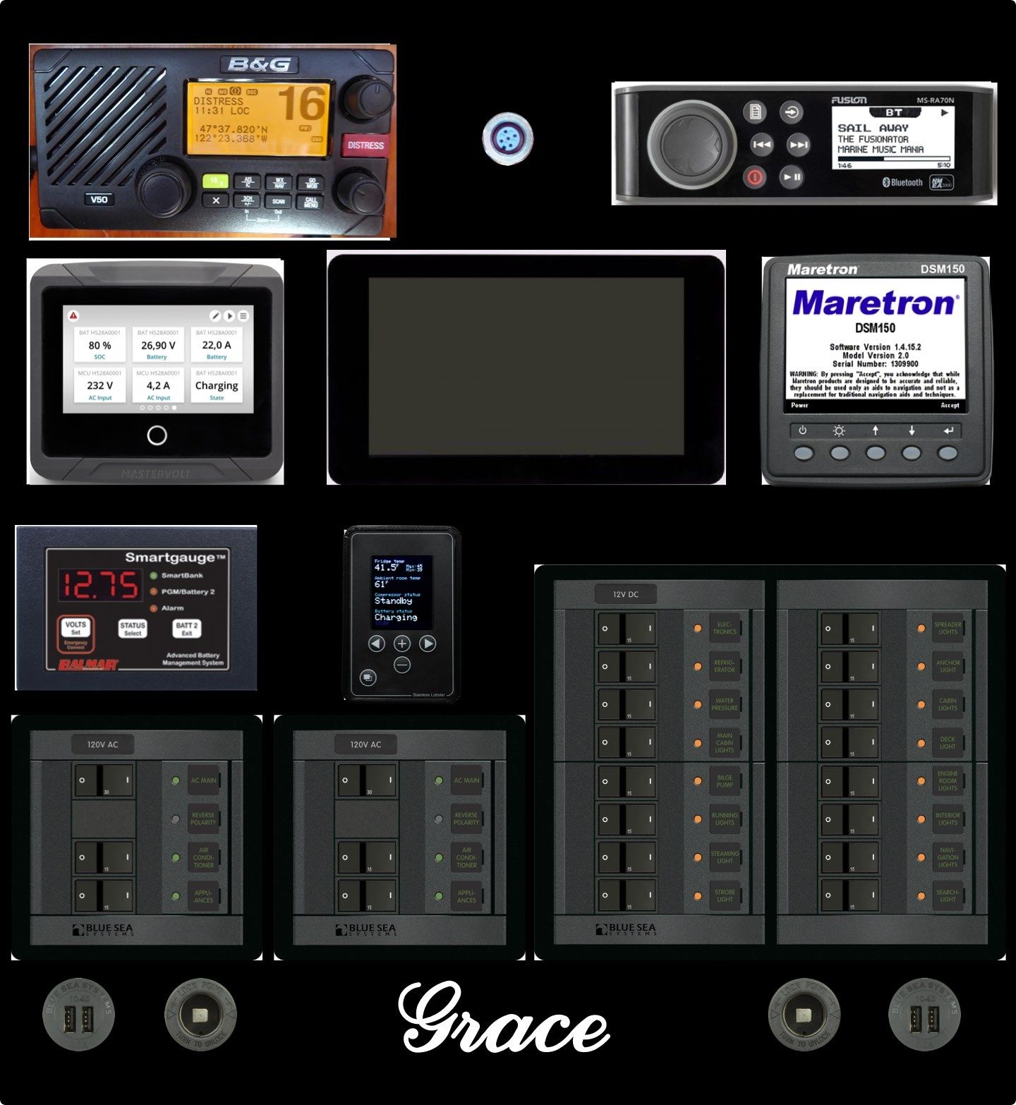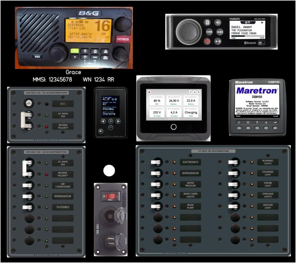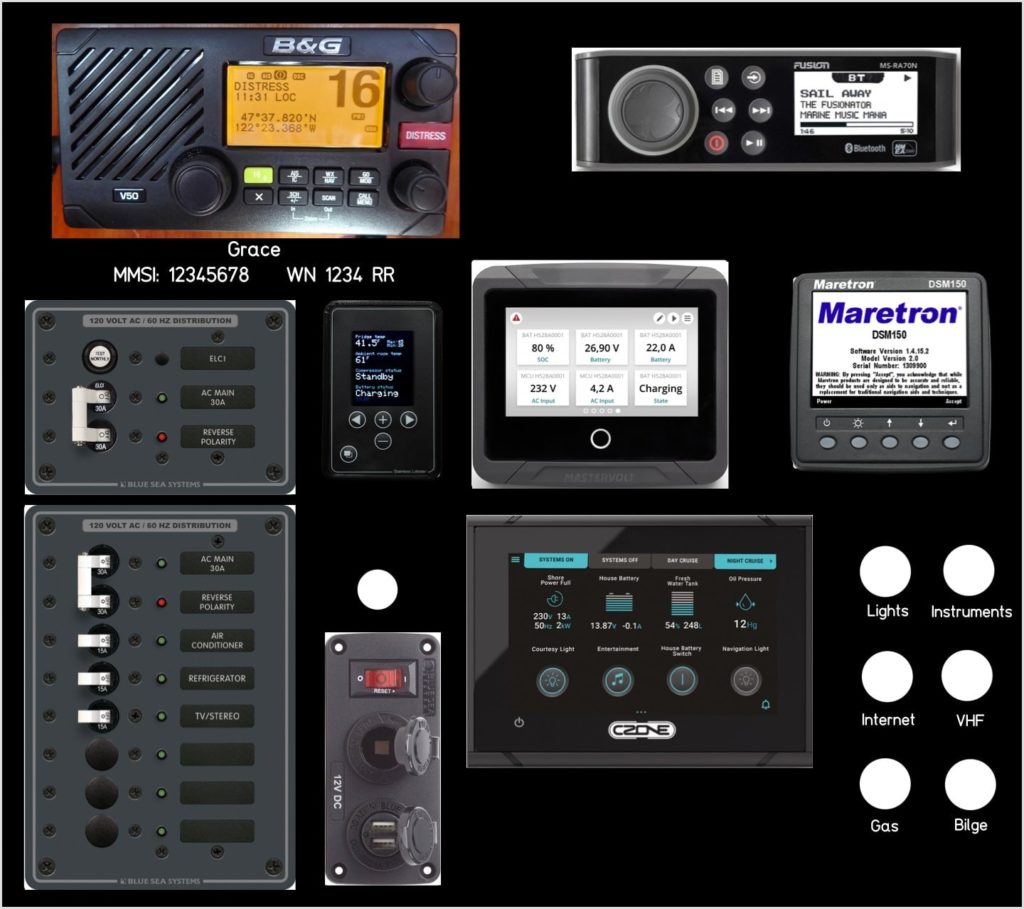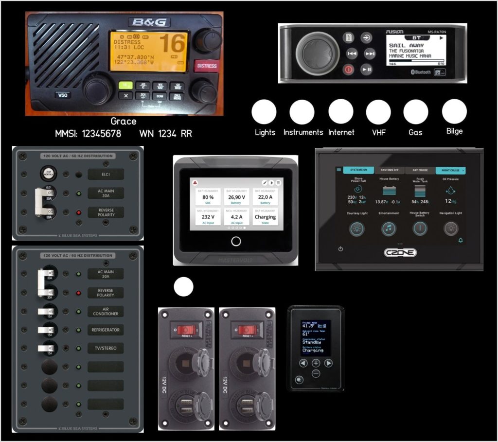 I used the CZone Touch 5 graphic above to show the electrical screens, but the display from my B&G Vulcan 5 would be similar, plus I would have charts, NMEA 2000 data, and be able to remove the Maretron, saving even more space. The 6 white circles and names to the right would be the push buttons to turn on/off critical circuits even if the Vulcan or the NMEA network were down for some reason.