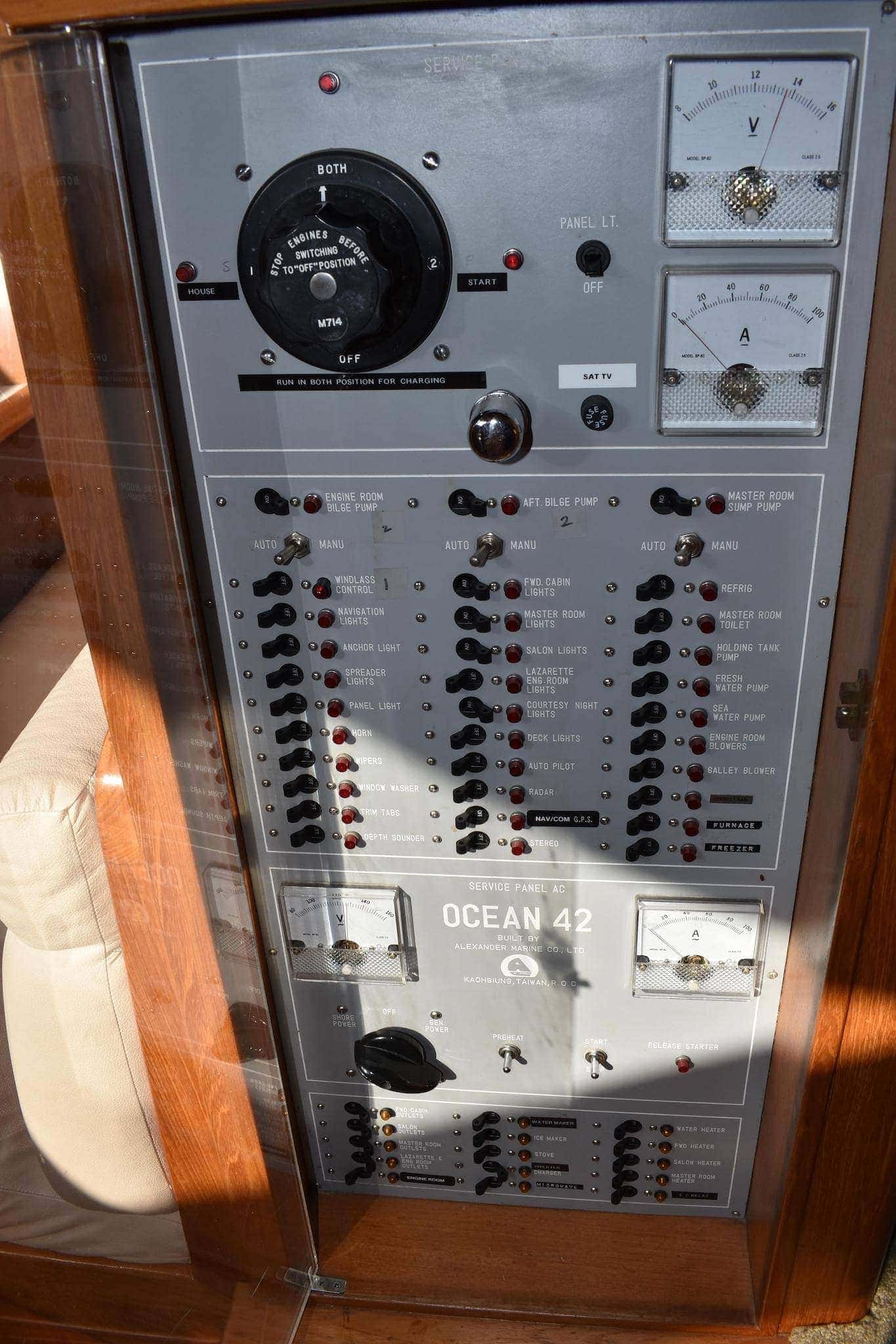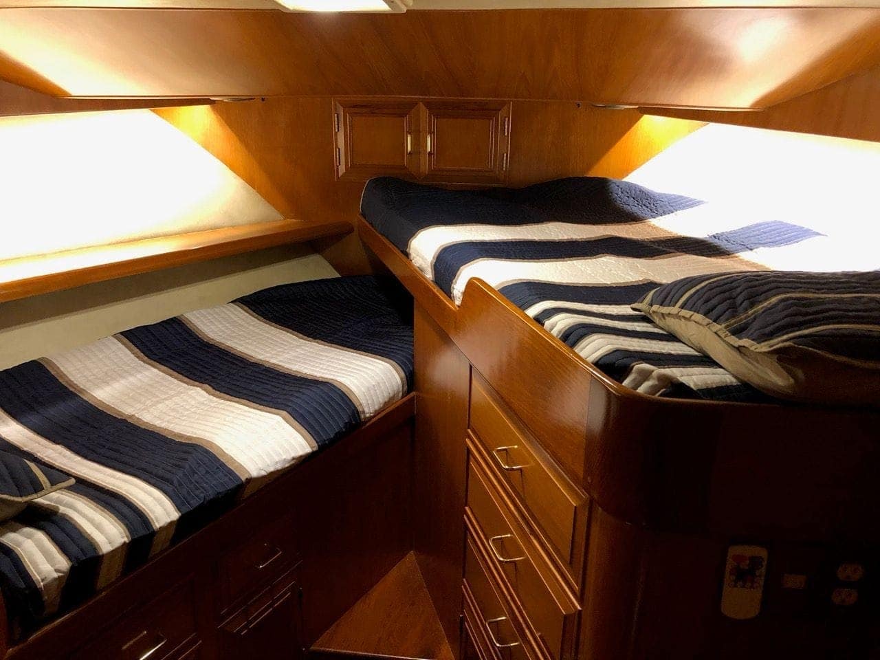 Two Volvo Penta TAMD 61A 310HP engines purr away quietly underneath the salon floor. There’s also a watermaker, Webasto diesel heater, Victron 3000W inverter/charger, water heater, engine/house/generator batteries, and much more.