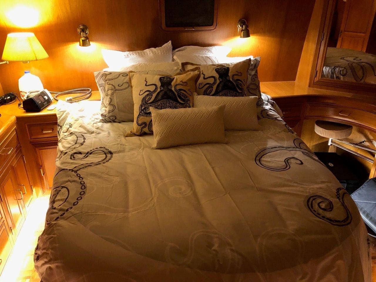Heading aft out of the salon and down into the master island queen bedroom. Even more drawers, two huge hanging closets, storage shelves, a vanity, and an en-suite head and shower on the port side.