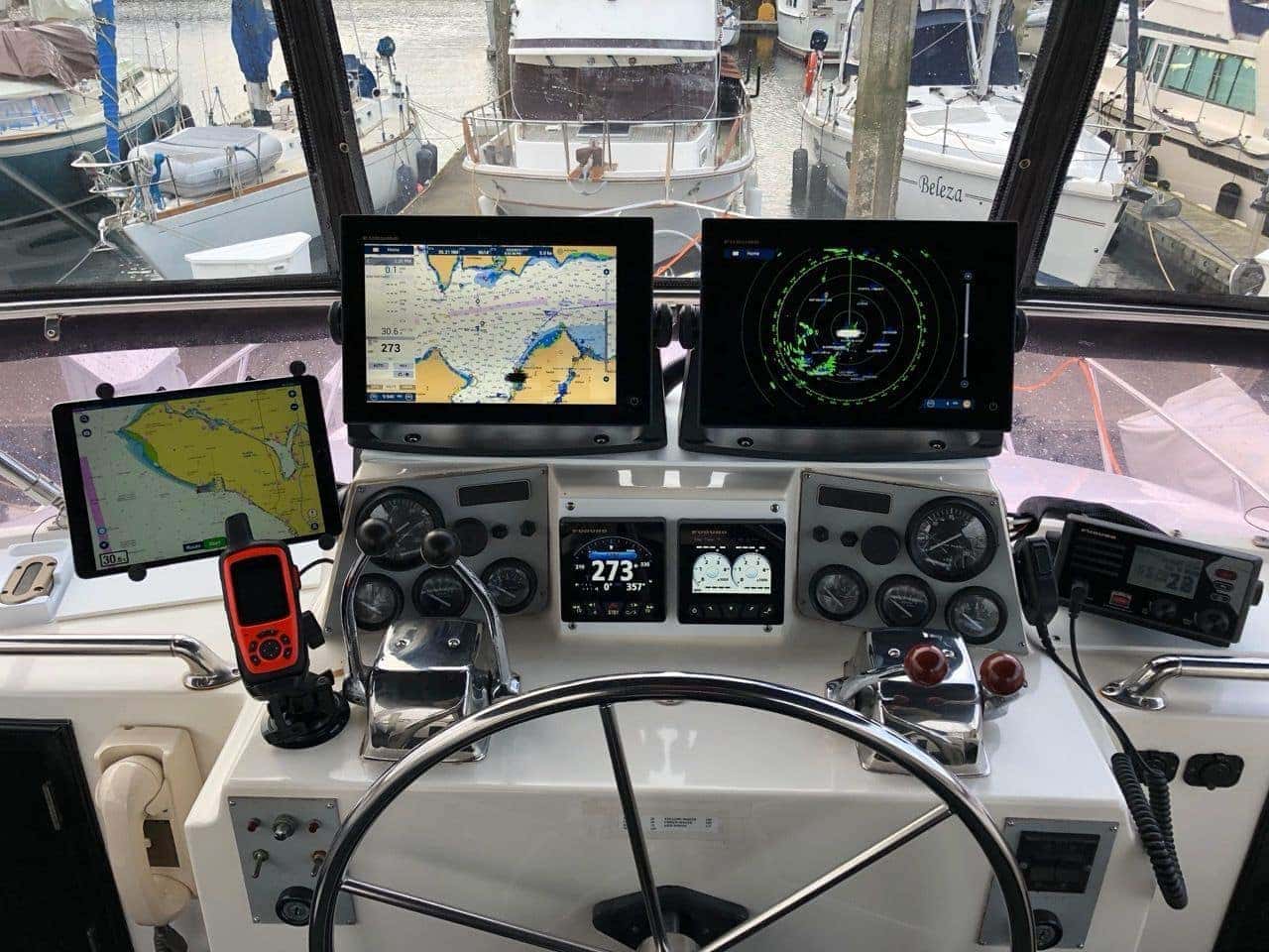 I recently replaced all of the electronics here, and added a lot more. I chose to go with Furuno TZT2 displays along with a NavPilot 300 and an FI-70 display. There’s control of the windlass, trim tabs, and various lights and items, plus of course an entire set of engine controls and gauges.