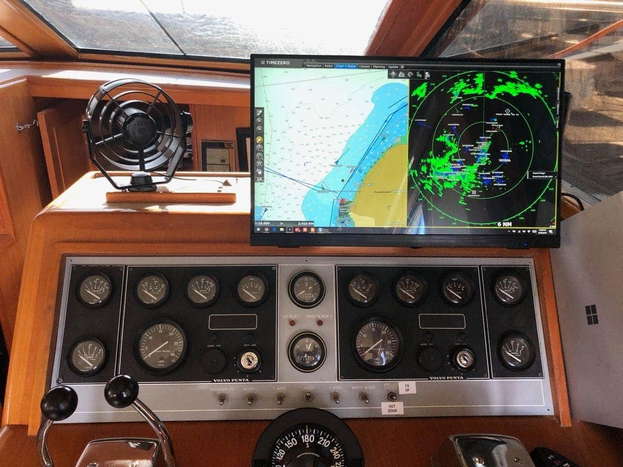 Further to the right is the salon driving station with even more engine instrumentation, autopilot, chartplotter, and pretty wood wheel.